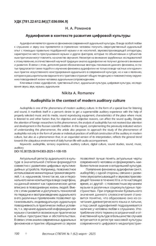 Аудиофилия является одним из феноменов современной аудиальной культуры. В виде особой любви к слушанию и звуку она проявляется в стремлении человека получить сверхчувственный аудиальный опыт с помощью правильно подобранной музыки и ее носителей, звуковоспроизводящей аппаратуры, характеристик места прослушивания музыки и других факторов, которые по объективным и субъективным причинам могут повлиять на качество звучания. Несмотря на внимание зарубежных исследователей к этому явлению, в отечественной научной традиции анализ аудиофилии не получил должного внимания и развития. В связи с этим, дополняя ранее обозначенные векторы понимания данного феномена, в статье предлагается также подойти к изучению феномена аудиофилии не только в виде частных или единичных практик искусственного конструирования аудиального в современной культуре, но и как к явлению, которое в расширительном варианте его трактовки отражает общую тенденцию к повсеместному окружению повседневной жизни человека аудиальным сопровождением.