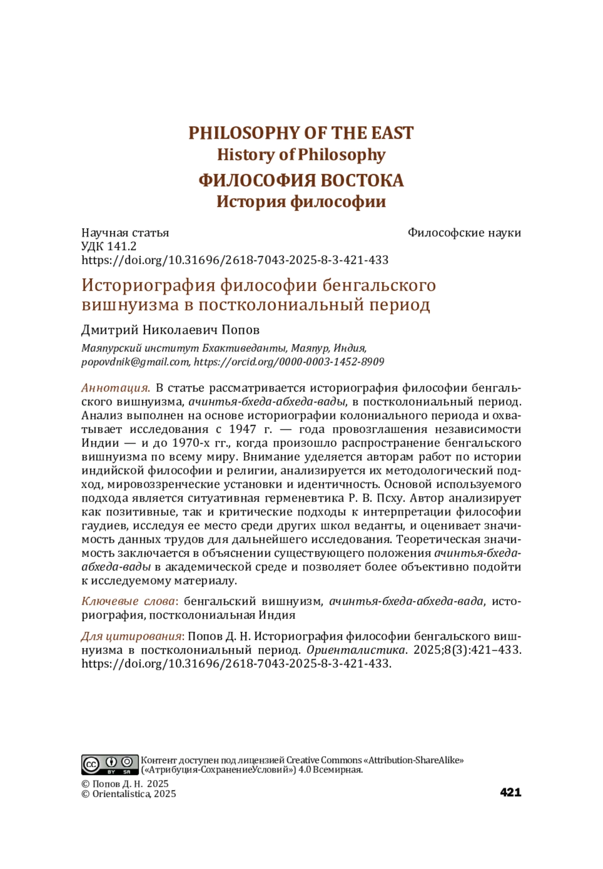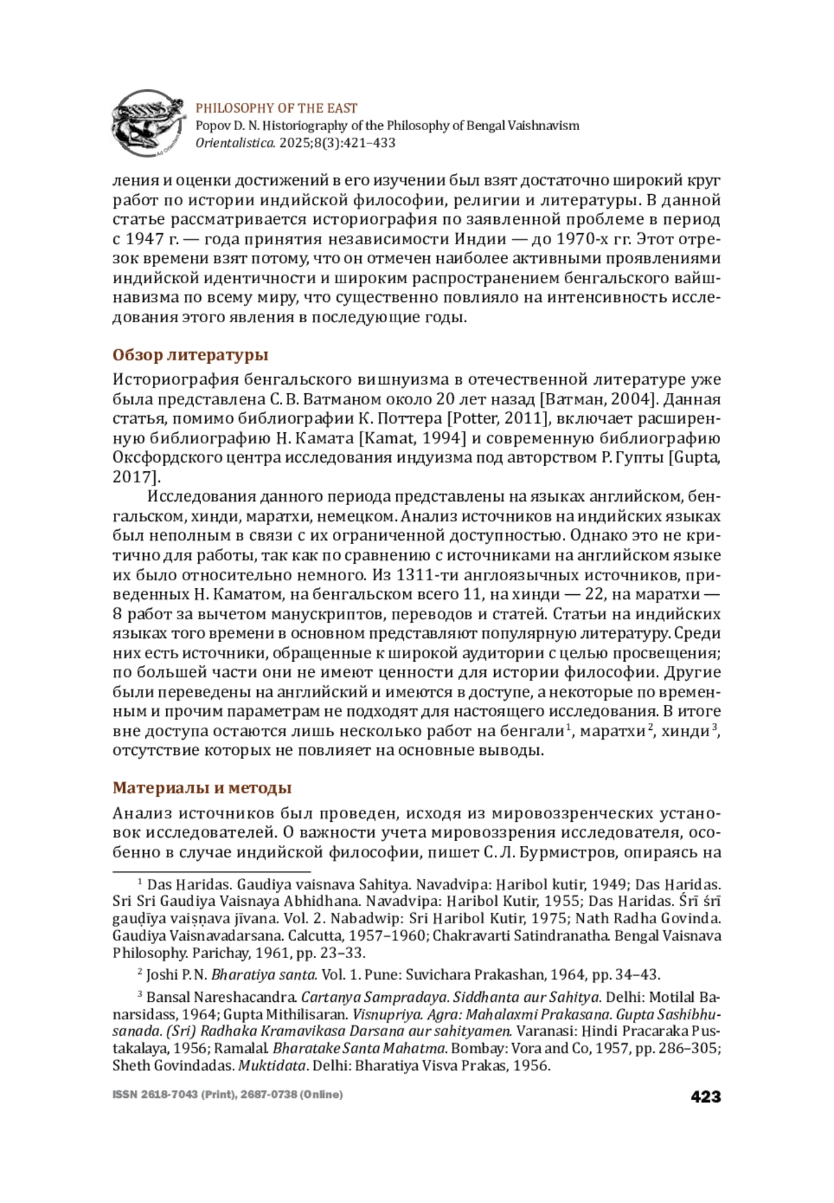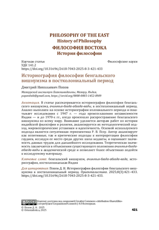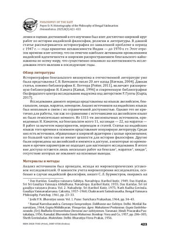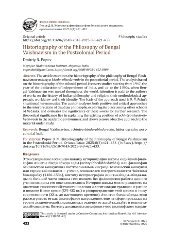 В статье рассматривается историография философии бенгальского вишнуизма, ачинтья-бхеда-абхеда-вады, в постколониальный период. Анализ выполнен на основе историографии колониального периода и охватывает исследования с 1947 г. — года провозглашения независимости Индии — и до 1970-х гг., когда произошло распространение бенгальского вишнуизма по всему миру. Внимание уделяется авторам работ по истории индийской философии и религии, анализируется их методологический подход, мировоззренческие установки и идентичность. Основой используемого подхода является ситуативная герменевтика Р. В. Псху. Автор анализирует как позитивные, так и критические подходы к интерпретации философии гаудиев, исследуя ее место среди других школ веданты, и оценивает значимость данных трудов для дальнейшего исследования. Теоретическая значимость заключается в объяснении существующего положения ачинтья-бхедаабхеда-вады в академической среде и позволяет более объективно подойти к исследуемому материалу.
