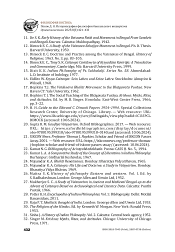13. Dimock E. C. Doctrine and Practice among the Vaisnavas of Bengal. History of Religions. 1963. No. 3, pp. 83-105.