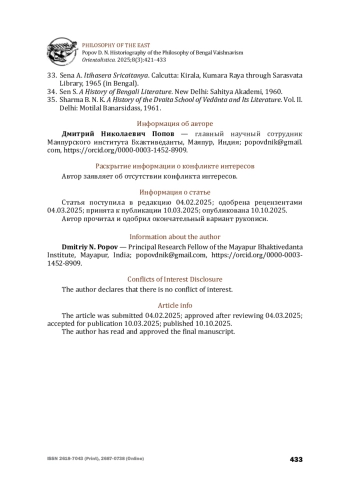 2. Ватман С. В. Бенгальский вайшнавизм. Под ред. С. В. Пахомова. СПб.: Издательство СПбГУ, 2005 [Vatman S. V. Bengal Vaishnavism. Ed. by S. V. Pakhomov. St. Petersburg: Izdatel’stvo of St. Petersburg State University, 2005 (in Russian)].