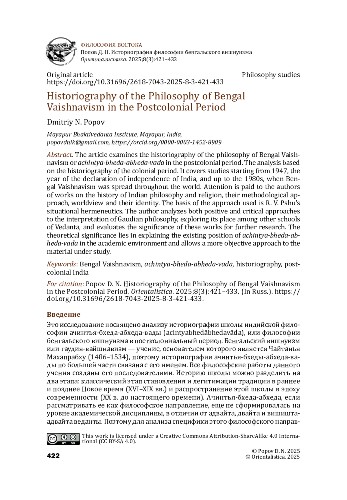 Это исследование посвящено анализу историографии школы индийской философии ачинтья- бхеда-абхеда-вады (acintyabhedābhedavāda), или философии бенгальского вишнуизма в постколониальный период. Бенгальский вишнуизм или гаудия- вайшнавизм — учение, основателем которого является Чайтанья Махапрабху (1486–1534), поэтому историография ачинтья- бхеды-абхеда-вады по большей части связана с его именем. Все философские работы данного учения созданы его последователями. Историю школы можно разделить на два этапа: классический этап становления и легитимации традиции в раннее и позднее Новое время (XVI–XIX вв.) и распространение этой школы в эпоху современности (XX в. до настоящего времени).