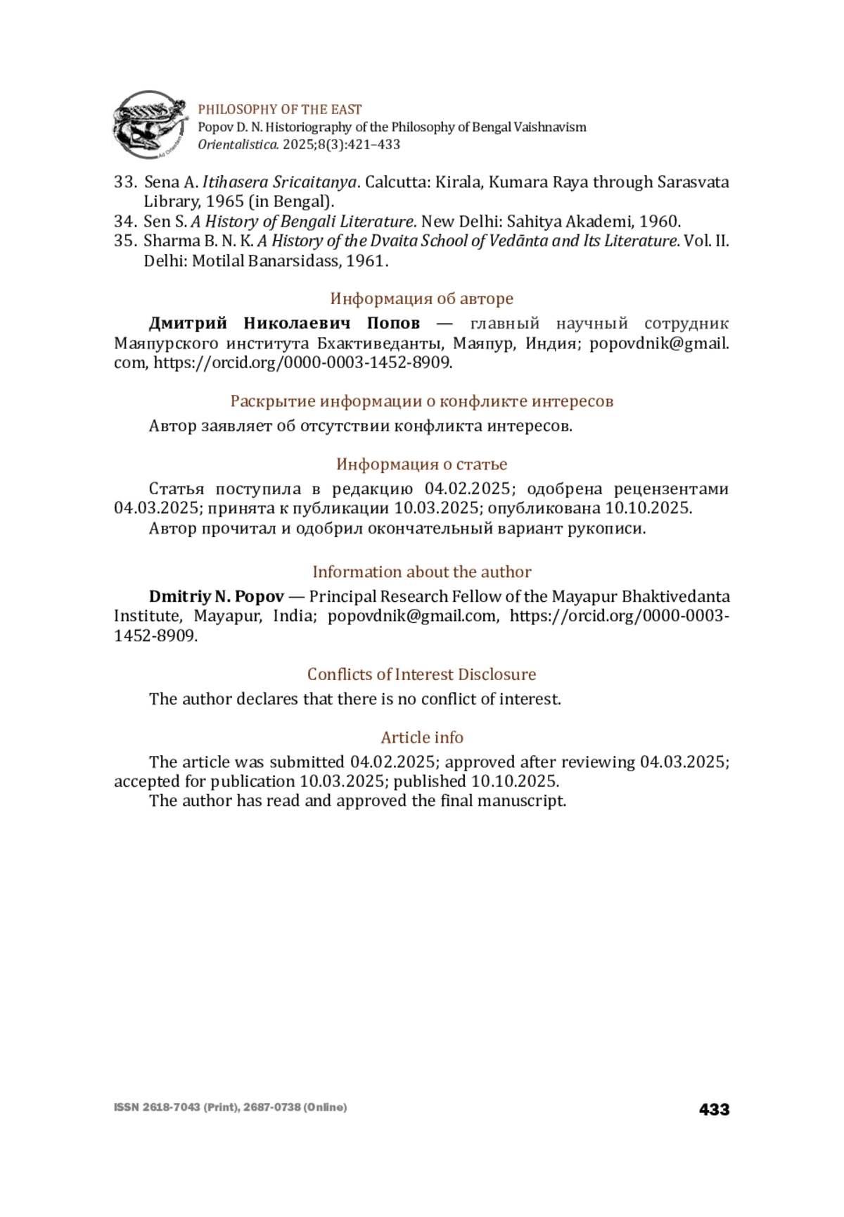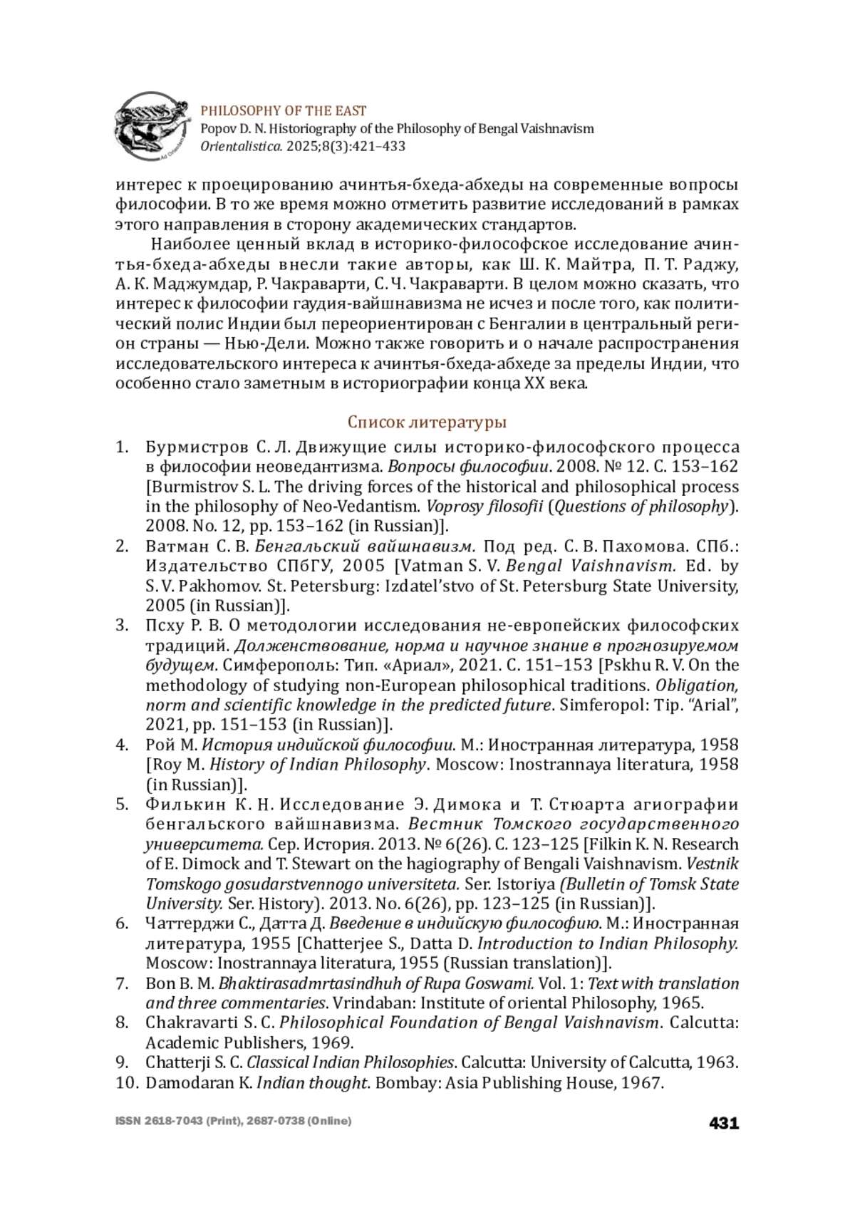 1. Бурмистров С. Л. Движущие силы историко-философского процесса в философии неоведантизма. Вопросы философии. 2008. № 12. С. 153-162 [Burmistrov S. L. The driving forces of the historical and philosophical process in the philosophy of Neo-Vedantism. Voprosy filosofii (Questions of philosophy). 2008. No. 12, pp. 153-162 (in Russian)].