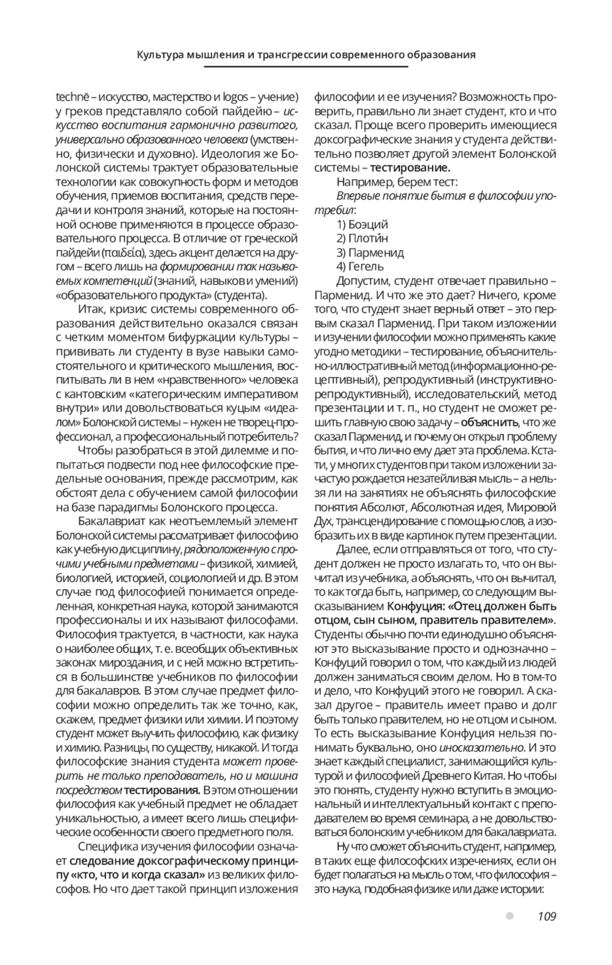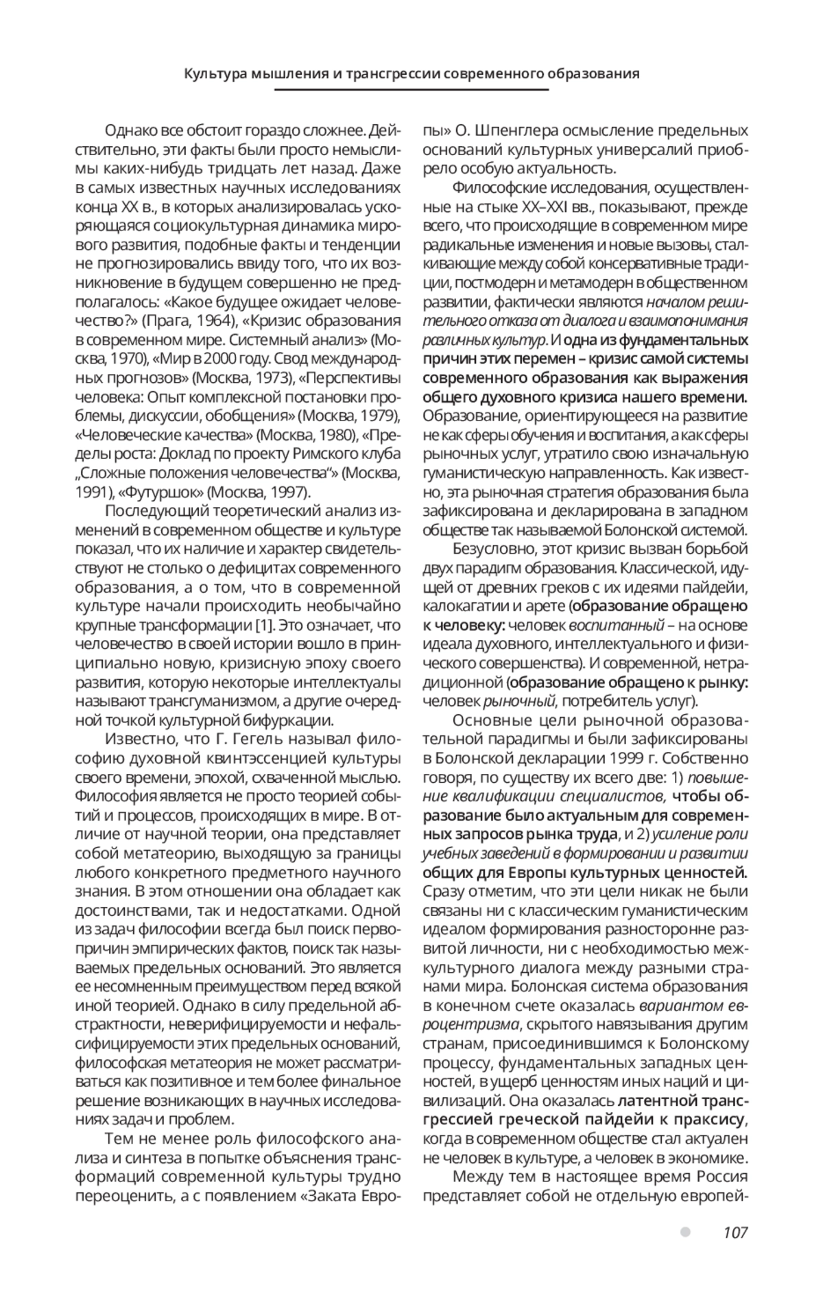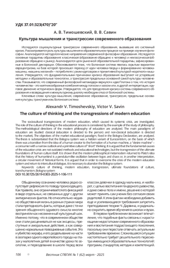 Исследуются социокультурные трансгрессии современного образования, вызвавшие его системный кризис. Рассматривается роль культуры мышления в образовательном процессе на примере изучения философии. Анализируются методологические направления современной философии образования. Исследуются основные парадигмы образования: классическая (образование обращено к человеку) и неклассическая (образование обращено к рынку). Анализируются цели рыночной образовательной парадигмы, зафиксированные в Болонской декларации. Обосновывается тезис, что Болонская система явилась скрытым вариантом евроцентризма, на базе которой произошел переход от идеи человека-творца к формированию человека-машины, «машины желаний» - потребителя с узким кругозором и примитивной культурой «короткого» мышления. Утверждается, что фундаментальными причинами кризиса образования выступают не устаревшие методики и образовательные технологии, а трансгрессия предельных оснований самой культуры человечества. Показывается, что современный философский метамодерн вернулся к идее Платона о том, что история человечества- это маятникообразные колебания между логосом и хаосом или, в другой интерпретации, круговое движение исторических форм. Утверждается, что для преодоления кризиса системы современного образования и возвращения к межкультурному диалогу необходим отказ от Болонской системы.