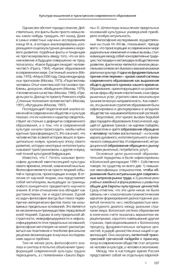 Философские исследования, осуществленные на стыке XX–XXI вв., показывают, прежде всего, что происходящие в современном мире радикальные изменения и новые вызовы, сталкивающие между собой консервативные традиции, постмодерн и метамодерн в общественном развитии, фактически являются началом решительного отказа от диалога и взаимопонимания различных культур. И одна из фундаментальных причин этих перемен – кризис самой системы современного образования как выражения общего духовного кризиса нашего времени. Образование, ориентирующееся на развитие не как сферы обучения и воспитания, а как сферы рыночных услуг, утратило свою изначальную гуманистическую направленность. Как известно, эта рыночная стратегия образования была зафиксирована и декларирована в западном обществе так называемой Болонской системой.