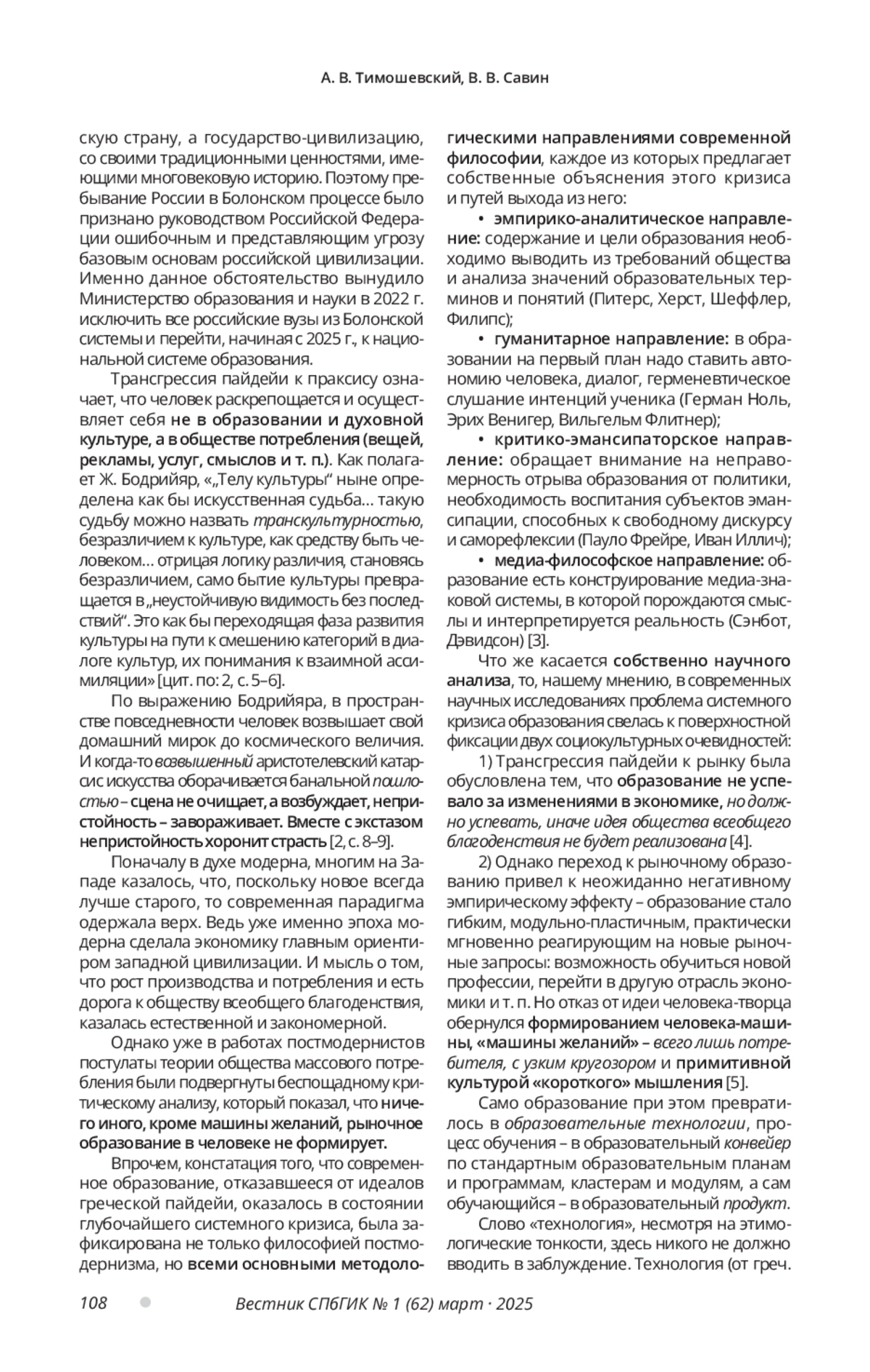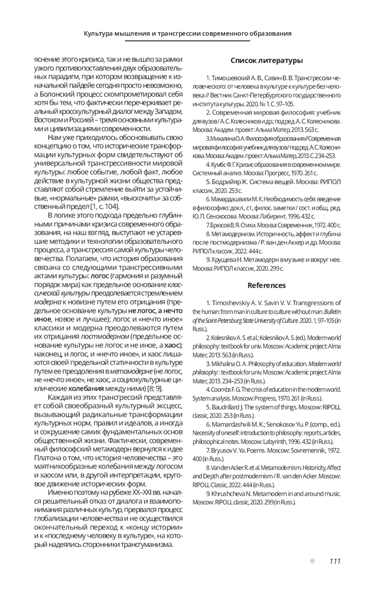 1. Тимошевский А. В., Савин В. В. Трансгрессии человеческого: от человека в культуре к культуре без человека // Вестник Санкт-Петербургского государственного института культуры. 2020. № 1. С. 97-105.