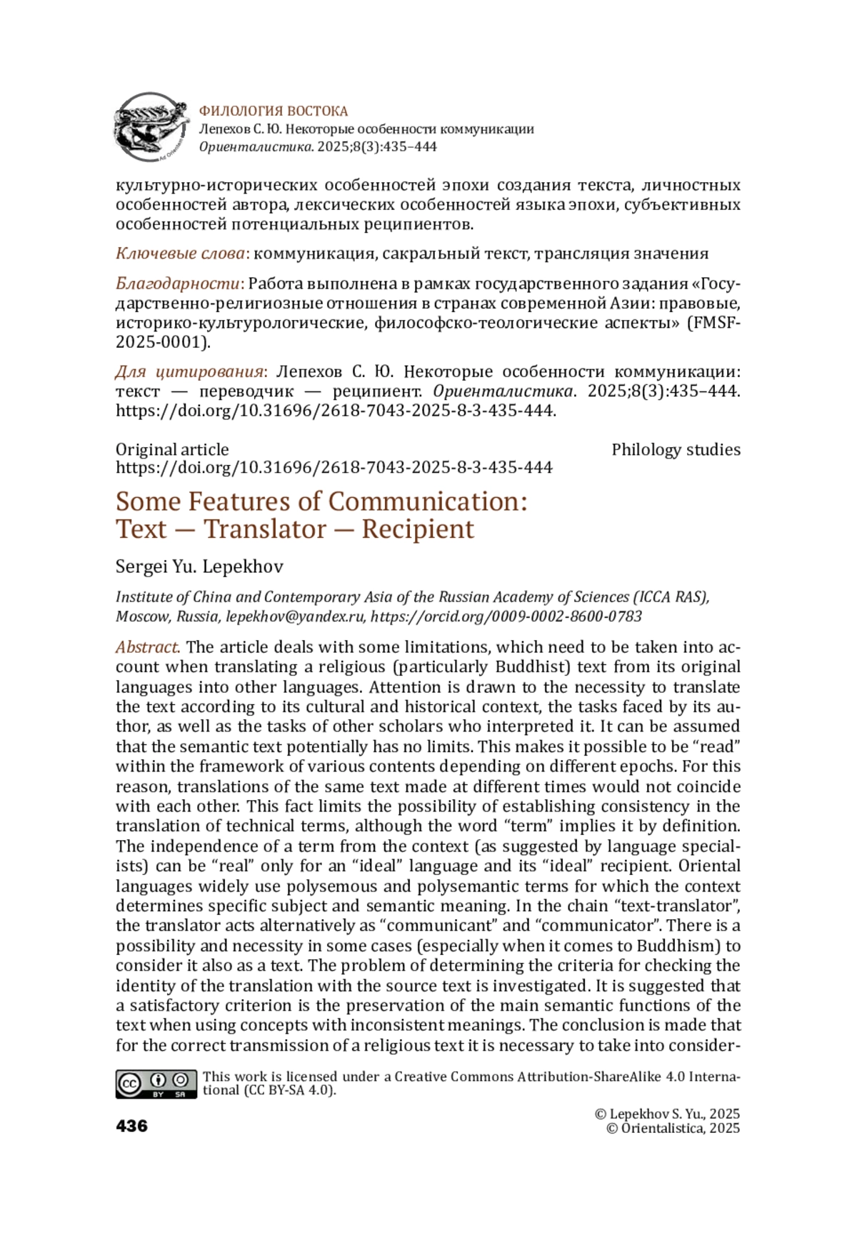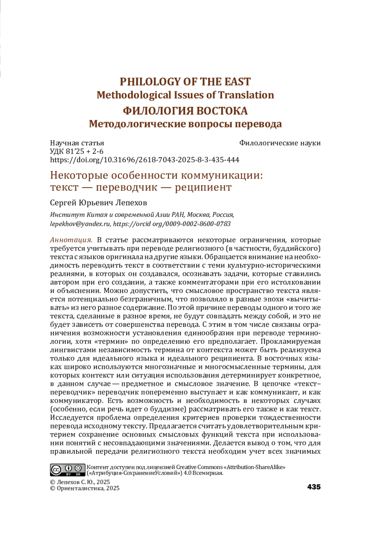 В статье рассматриваются некоторые ограничения, которые требуется учитывать при переводе религиозного (в частности, буддийского) текста с языков оригинала на другие языки. Обращается внимание на необходимость переводить текст в соответствии с теми культурно- историческими реалиями, в которых он создавался, осознавать задачи, которые ставились автором при его создании, а также комментаторами при его истолковании и объяснении. Можно допустить, что смысловое пространство текста является потенциально безграничным, что позволяло в разные эпохи «вычитывать» из него разное содержание. По этой причине переводы одного и того же текста, сделанные в разное время, не будут совпадать между собой, и это не будет зависеть от совершенства перевода. С этим в том числе связаны ограничения возможности установления единообразия при переводе терминологии, хотя «термин» по определению его предполагает. Прокламируемая лингвистами независимость термина от контекста может быть реализуема только для идеального языка и идеального реципиента. В восточных языках широко используются многозначные и многосмысленные термины, для которых контекст или ситуация использования детерминирует конкретное, в данном случае — предметное и смысловое значение. В цепочке «текст– переводчик» переводчик попеременно выступает и как коммуникант, и как коммуникатор. Есть возможность и необходимость в некоторых случаях (особенно, если речь идет о буддизме) рассматривать его также и как текст. Исследуется проблема определения критериев проверки тождественности перевода исходному тексту. Предлагается считать удовлетворительным критерием сохранение основных смысловых функций текста при использовании понятий с несовпадающими значениями. Делается вывод о том, что для правильной передачи религиозного текста необходим учет всех значимых культурно- исторических особенностей эпохи создания текста, личностных особенностей автора, лексических особенностей языка эпохи, субъективных особенностей потенциальных реципиентов.