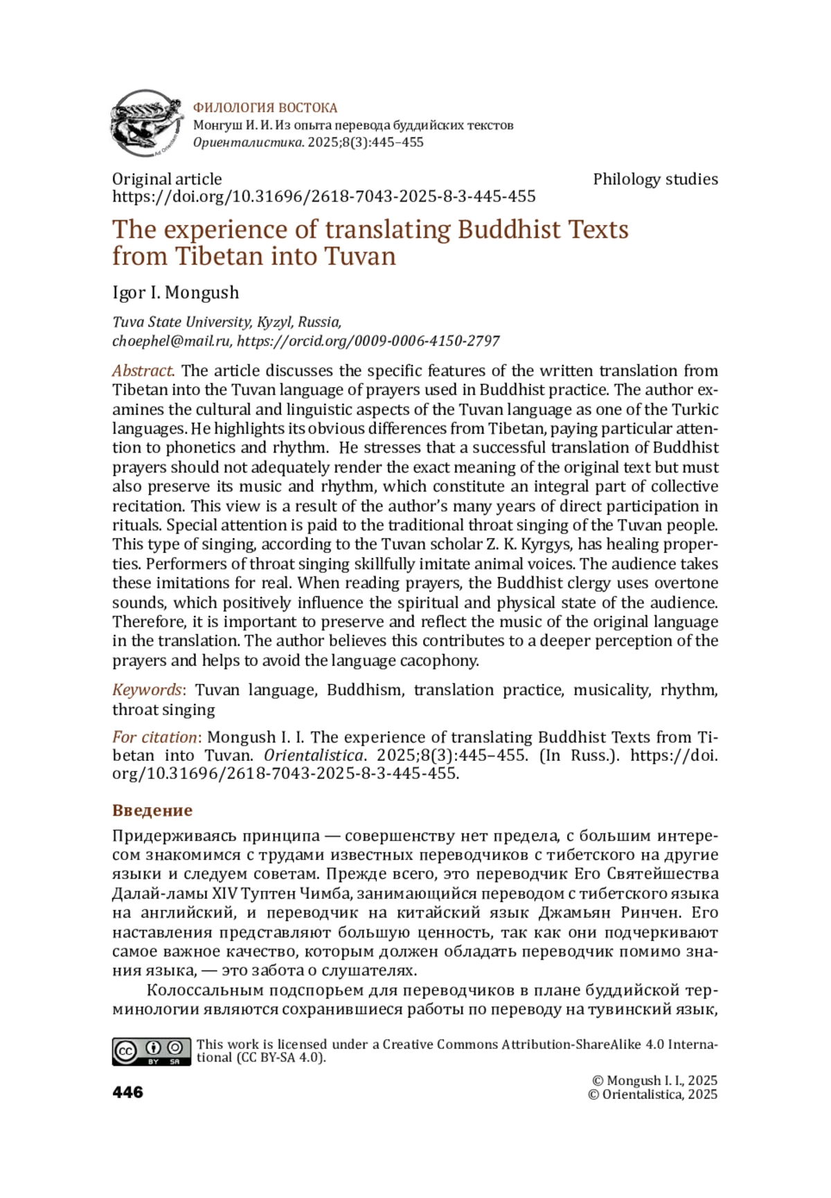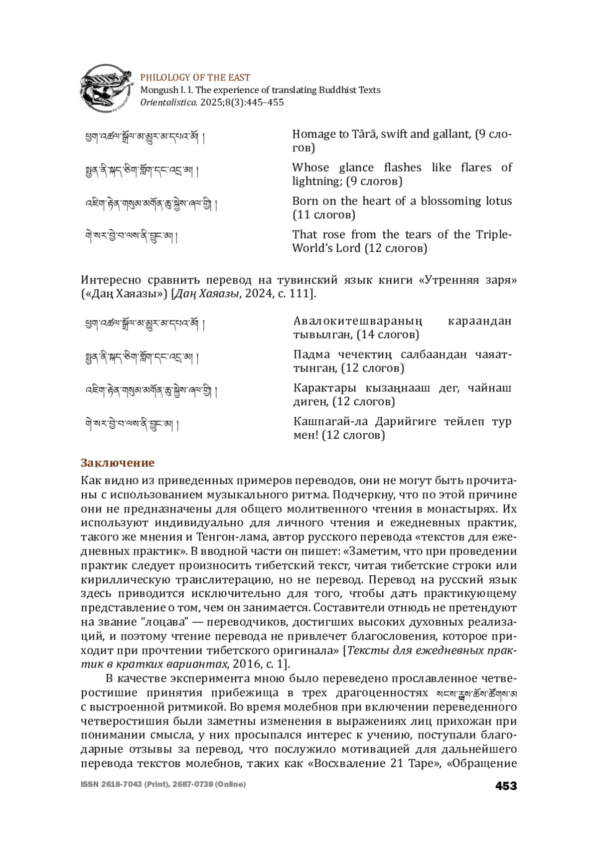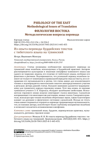 Статья посвящена особенностям письменного перевода на тувинский язык молебнов, используемых в буддийской практике. Автором рассматривается культурная и языковая специфика тувинского языка как одного из тюркских языков, его отличие от тибетского языка, особенно его фонетики и ритмики. Подчеркивается, что успешный перевод молебнов зависит не только от понимания и правильной передачи смысла текста, но и сохранения его музыкальности и ритма, что очень важно для коллективного чтения и подтверждается многолетним опытом непосредственного участия в ритуалах автора данной статьи. Большое внимание уделяется традиционному для тувинского народа горловому пению. Этот вид пения, по мнению тувинского ученого З. К. Кыргыса, обладает целебными свойствами. Исполнители горлового пения искусно имитируют голоса животных. Слушатели воспринимают эти имитации как настоящие, живые голоса. Священнослужители, используя при чтении молебнов обертонные звуки, также благотворно влияют на духовное и физическое состояние слушателей. Исходя из этого, очень важно сохранить и отразить в переводе традиционную музыкальность, что, по мнению автора, способствует более глубокому восприятию молебнов и позволяет исключить возникновение какофонии.