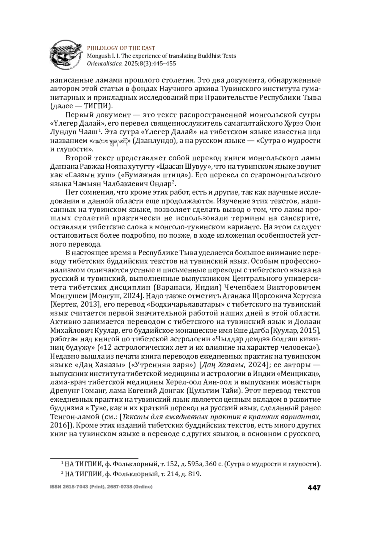 Процесс научного перевода Буддийского канона на русский язык начат во второй половине XIX — начале ХХ в., однако продвижение идет не так быстро, и причин для этого много. Во-первых, колоссальный объем Буддийского канона, освоение его у всех народов занимало многие сотни лет (в Китае — 800 лет, в Тибете — 600, в Монголии — около 400). Во-вторых, адекватность перевода требует не только хороших лингвистических знаний, но и глубокой специализации в разных сферах буддийских наук, в которых эпистемология отличается от современной, европейской. Сегодня рост интереса россиян к Учению Будды и укрепление его влияния в мировом масштабе ставит перед нами задачи углубления и расширения буддологических исследований как на академическом научном, так и на практическом уровнях и прежде всего — ускорения процесса переводов буддийских канонических текстов на русский язык. Развитие современных технологий, цифровых методов хранения, распространения и обработки информации позволяет переложить рутинные процессы переводческой работы на автоматизированные системы, использование ИИ должно интенсифицировать процессы перевода буддийских текстов. Автор обращает внимание читателя на многообразие форм передачи Святого писания буддистов, которые зависят от исторических условий и специфики культурного багажа в каждом из регионов мира, где адаптировался буддизм. Однако формальные признаки носителя письменной информации — от пальмовых листьев до цифрового формата — не изменяют философского содержания и сути буддизма.