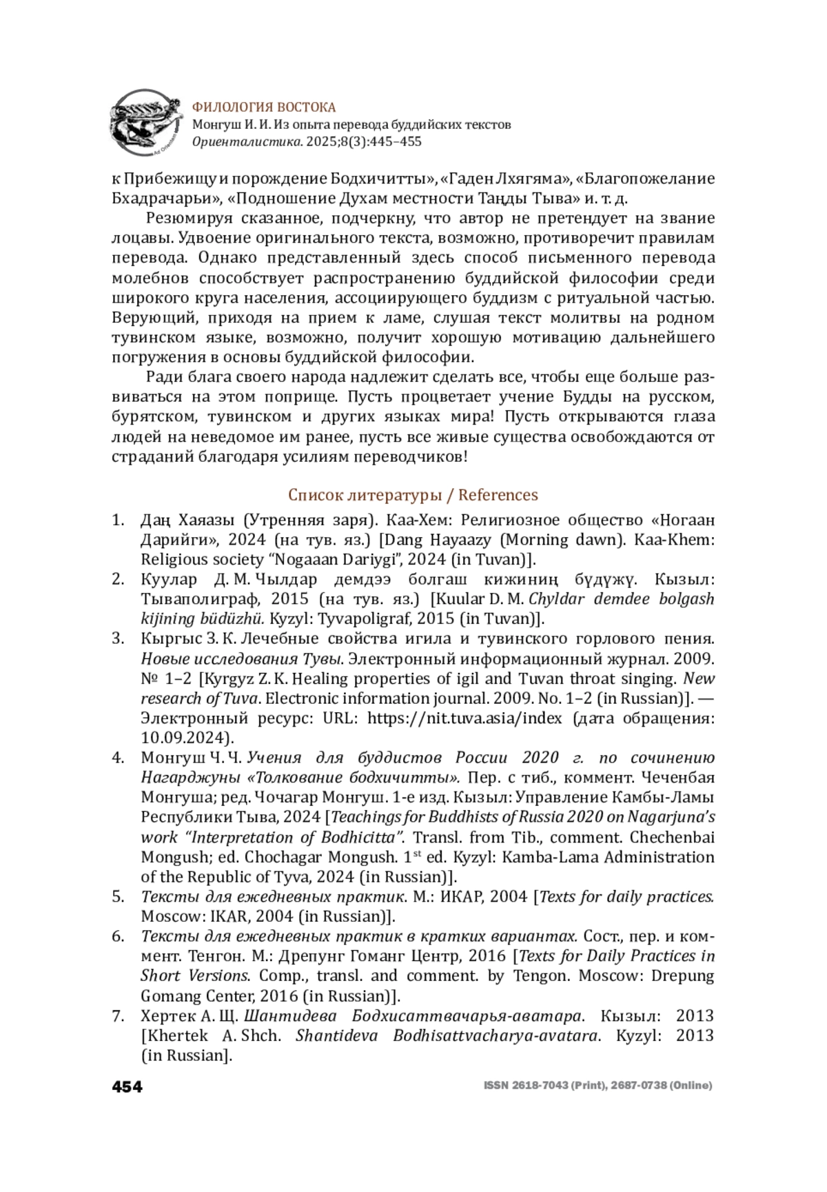 4. Монгуш Ч. Ч. Учения для буддистов России 2020 г. по сочинению Нагарджуны “Толкование бодхичитты”. Пер. с тиб., коммент. Чеченбая Монгуша; ред. Чочагар Монгуш. 1-е изд. Кызыл: Управление Камбы-Ламы Республики Тыва, 2024 [Teachings for Buddhists of Russia 2020 on Nagarjuna’s work “Interpretation of Bodhicitta”. Transl. from Tib., comment. Chechenbai Mongush; ed. Chochagar Mongush. 1st ed. Kyzyl: Kamba-Lama Administration of the Republic of Tyva, 2024 (in Russian)].