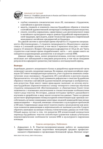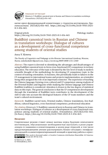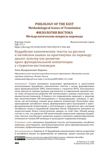 Статья посвящена выявлению преимуществ и недостатков использования буддийских канонических текстов с целью формирования кросс-функциональной (КФ) компетенции у студентов ВУЗа. Актуальность темы диктуется низким уровнем изученности в современной научной мысли темы методологии развития КФ компетенции в рамках подготовки специалистов-востоковедов. В бизнесе это периодически приводит к неудачам при имплементации КФ-менеджмента в международных командах и проектах, где востоковеду отводят роль важного коннектора. Рассмотрен опыт преподавания китайского языка, формирования кросс-культурной и кроссфункциональной компетенции у востоковедов и лингвистов при изучении китайского языка и буддийской традиции Китая. Обращается внимание на недостаточный объем статистических данных по этой теме. Общий вывод состоит в том, что развитие КФ компетенций посредством перевода буддийских текстов способствует развитию навыка учитывать мировоззренческие особенности членов КФ-команды и культурного окружения команды.