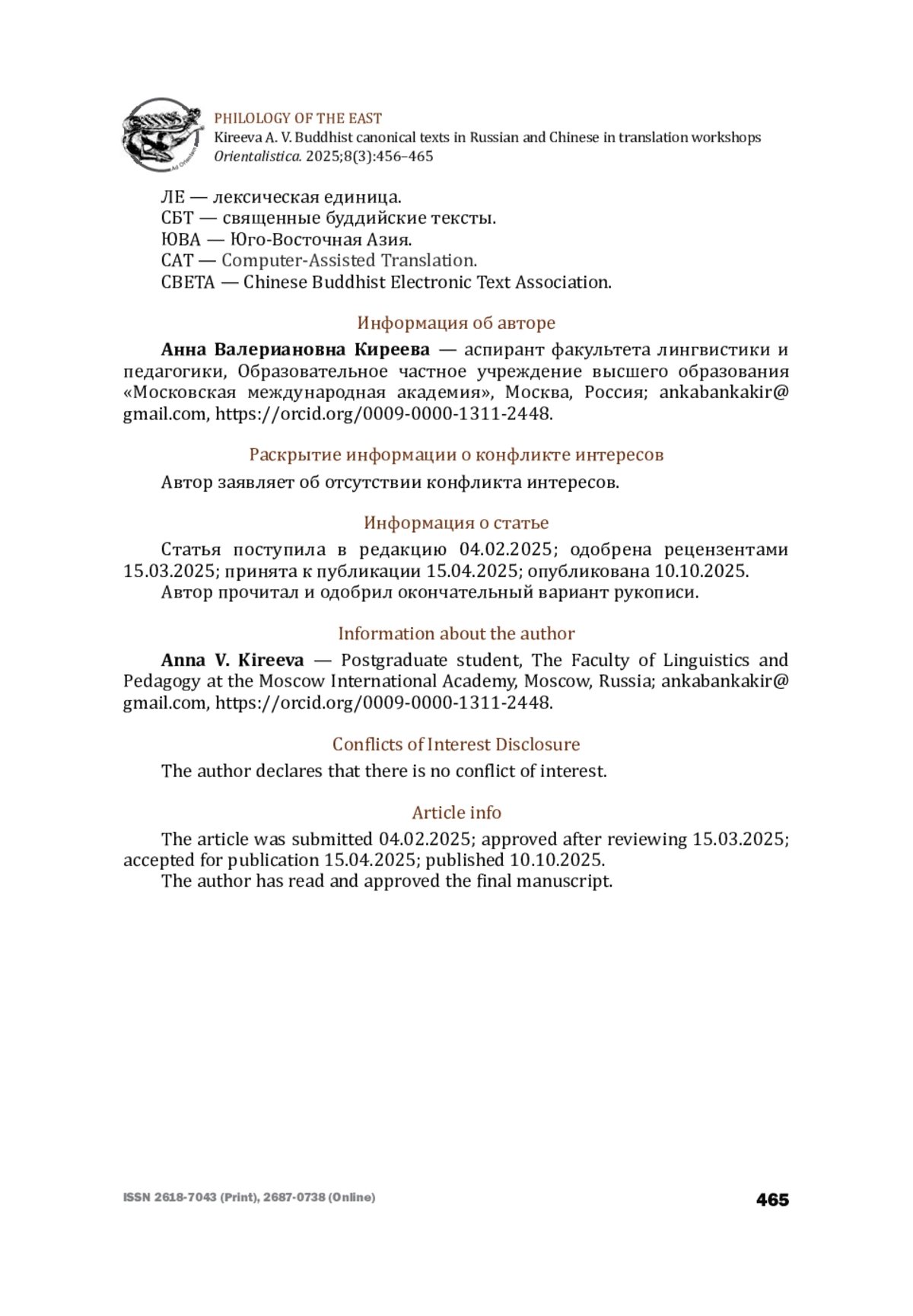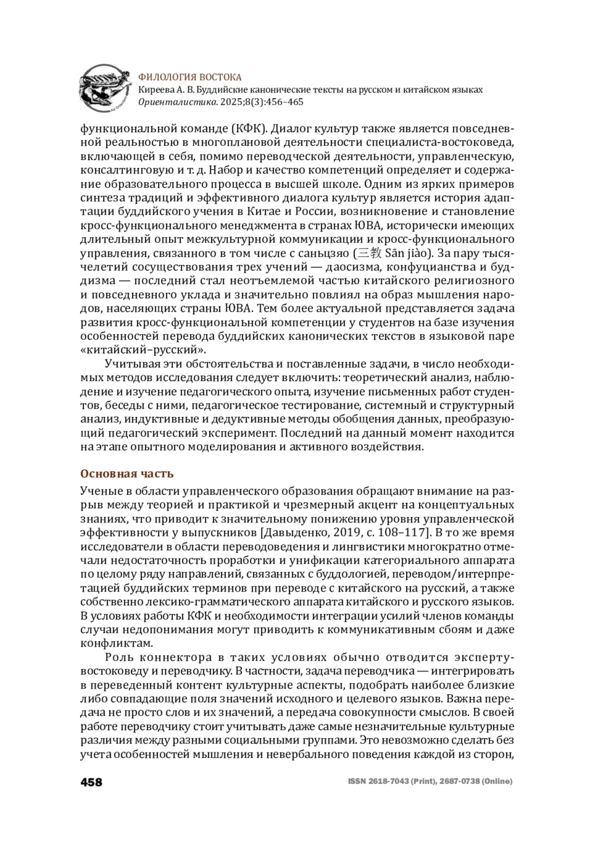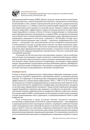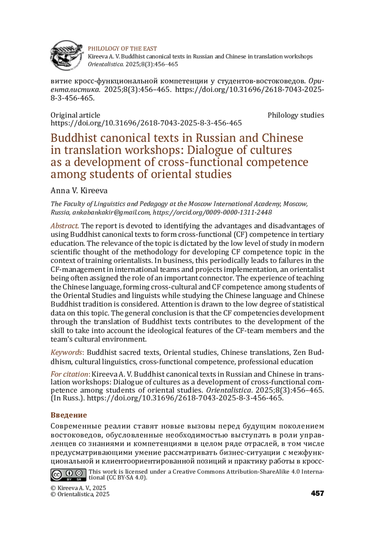 Современные реалии ставят новые вызовы перед будущим поколением востоковедов, обусловленные необходимостью выступать в роли управленцев со знаниями и компетенциями в целом ряде отраслей, в том числе предусматривающими умение рассматривать бизнес- ситуации с межфункциональной и клиентоориентированной позиций и практику работы в кроссфункциональной команде (КФК). Диалог культур также является повседневной реальностью в многоплановой деятельности специалиста- востоковеда, включающей в себя, помимо переводческой деятельности, управленческую, консалтинговую и т. д. Набор и качество компетенций определяет и содержание образовательного процесса в высшей школе. Одним из ярких примеров синтеза традиций и эффективного диалога культур является история адаптации буддийского учения в Китае и России, возникновение и становление кросс- функционального менеджмента в странах ЮВА, исторически имеющих длительный опыт межкультурной коммуникации и кросс- функционального управления, связанного в том числе с саньцзяо (三教 Sān jiào). За пару тысячелетий сосуществования трех учений — даосизма, конфуцианства и буддизма — последний стал неотъемлемой частью китайского религиозного и повседневного уклада и значительно повлиял на образ мышления народов, населяющих страны ЮВА. Тем более актуальной представляется задача развития кросс- функциональной компетенции у студентов на базе изучения особенностей перевода буддийских канонических текстов в языковой паре «китайский–русский».