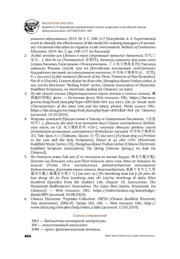 1. Давыденко А. В. Опытно-экспериментальная работа по выявлению эффективности модели подготовки менеджеров среднего профессионального образования к организации безопасной среды. Вестник непрерывного образования. 2019. № 3. С. 108-117 [Davydenko A. V. Experimental work to identify the effectiveness of the model for training managers of secondary vocational education to organize a safe environment. Bulletin of Continuous Education. 2019. No. 3, pp. 108-117 (in Russian)].