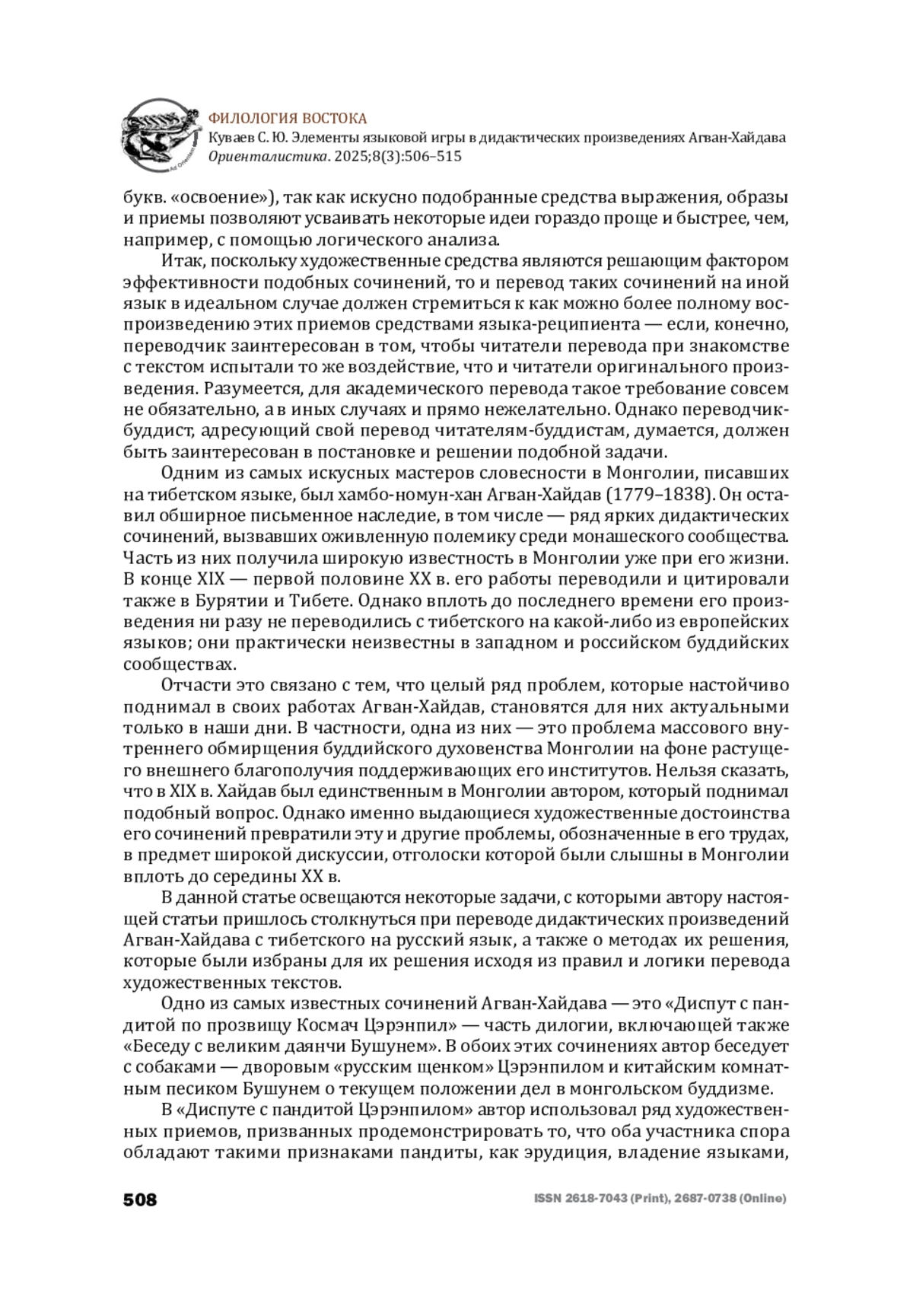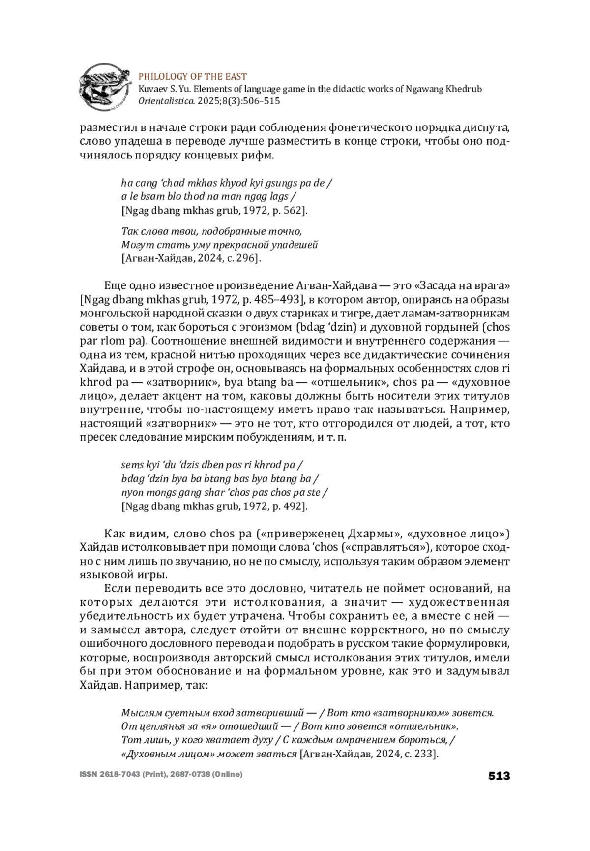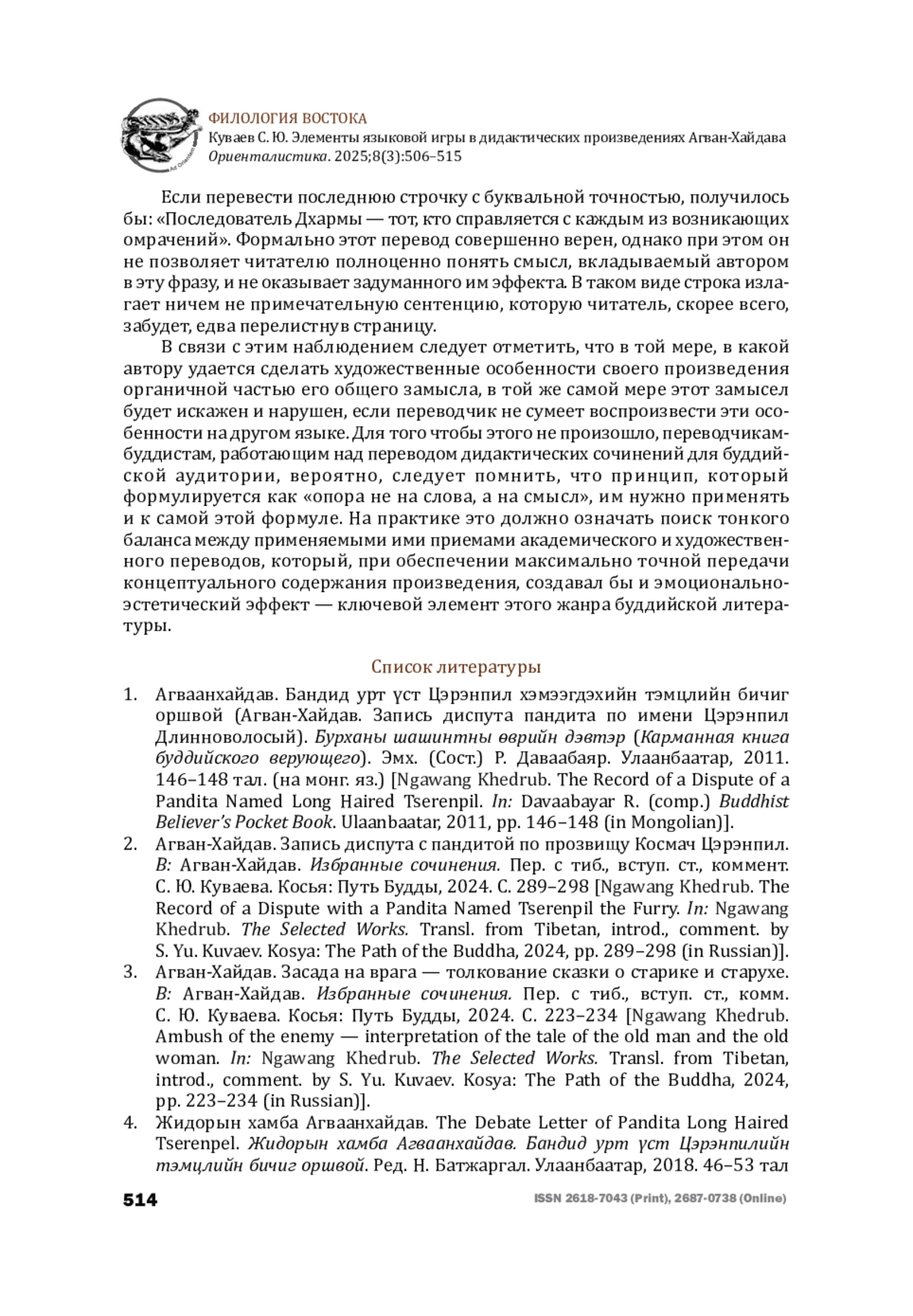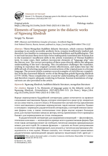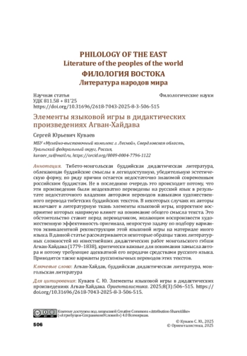 Тибето-монгольская буддийская дидактическая литература, облекающая буддийские смыслы в легкодоступную, убедительную эстетическую форму, по ряду причин остается недостаточно знакомой современным российским буддистам. Не в последнюю очередь это происходит потому, что эти произведения были неадекватно переведены на русский язык в результате недостаточного владения авторами переводов навыками художественного перевода тибетских буддийских текстов. В некоторых случаях их авторы включают в литературную ткань элементы языковой игры, корректное восприятие которых напрямую влияет на понимание общего смысла текста. Это обстоятельство ставит перед переводчиком, желающим воспроизвести художественную эффективность оригинала, непростую задачу по подбору вариантов эквивалентной реконструкции этой языковой игры на материале иного языка. В данной статье рассматриваются некоторые образцы таких литературных сложностей из известнейших дидактических работ монгольского гэбши Агван-Хайдава (1779–1838), критически важные для понимания замысла автора и потому требующие адекватной его передачи средствами русского языка. Приводятся также варианты русскоязычных переводов этих текстов.