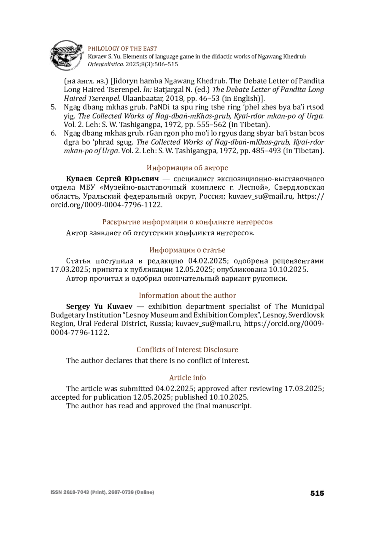 2. Агван-Хайдав. Запись диспута с пандитой по прозвищу Космач Цэрэнпил. В: Агван-Хайдав. Избранные сочинения. Пер. с тиб., вступ. ст., коммент. С. Ю. Куваева. Косья: Путь Будды, 2024. С. 289-298 [Ngawang Khedrub. The Record of a Dispute with a Pandita Named Tserenpil the Furry. In: Ngawang Khedrub. The Selected Works. Transl. from Tibetan, introd., comment. by S. Yu. Kuvaev. Kosya: The Path of the Buddha, 2024, pp. 289-298 (in Russian)].