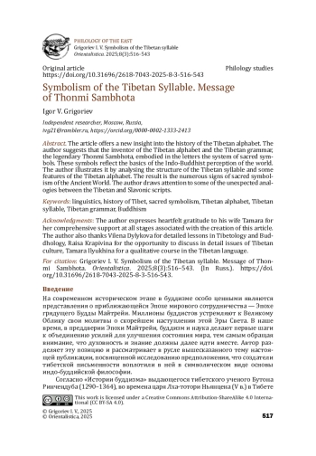 В статье рассмотрено предположение о том, что при создании тибетских алфавита и грамматики легендарным Тхонми Самбхотой в них были также воплощены сакральные символы, отражающие основы индо-буддийского мировоззрения. Представлены результаты исследования этой темы, охватывающие особенности тибетского алфавита и конструкции тибетского слога. Изложены различные подходы к анализу строения тибетского слога, которые обнаруживают в его устройстве присутствие многочисленных признаков священной для буддизма символики. Интересными являются определенные параллели рассматриваемых лингвистических явлений с другими областями знания, а также заметные аналогии в истории создания тибетской и славянской письменностей. Представленные данные могут быть полезны для развития соответствующих областей российского востоковедения, лингвистической науки и междисциплинарных исследований.