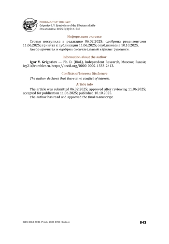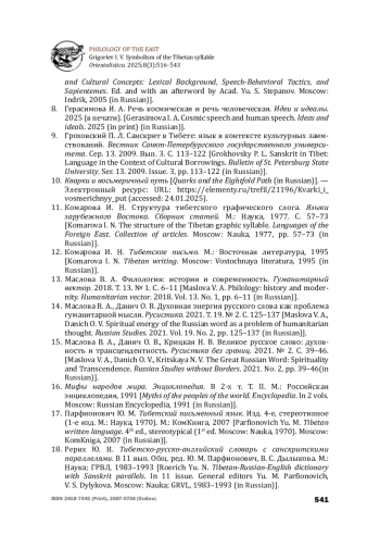 11. Комарова И. Н. Структура тибетского графического слога. Языки зарубежного Востока. Сборник статей. М.: Наука, 1977. С. 57-73 [Komarova I. N. The structure of the Tibetan graphic syllable. Languages of the Foreign East. Collection of articles. Moscow: Nauka, 1977, pp. 57-73 (in Russian)].