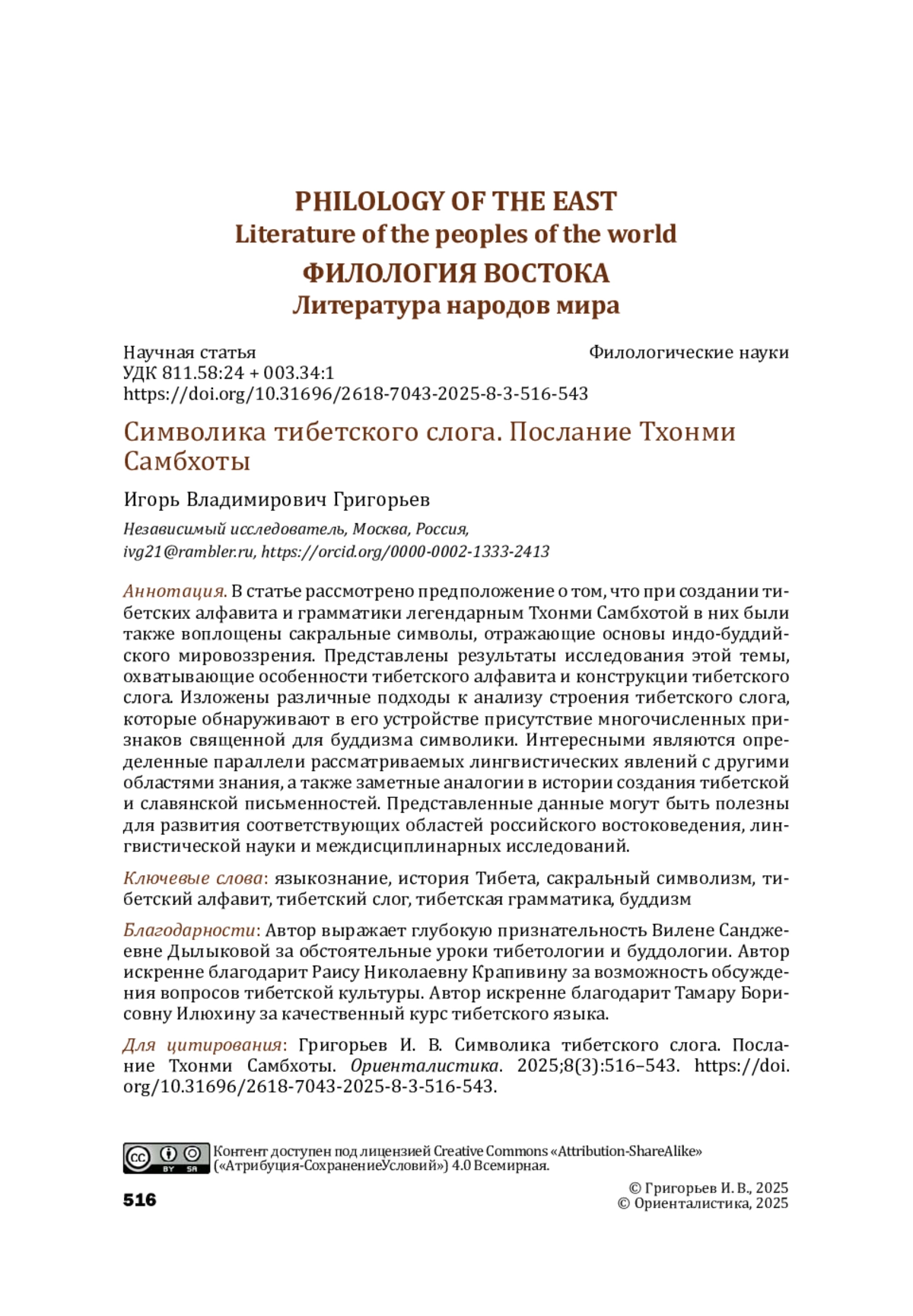 Текущий номер нашей «Ориенталистики» посвящен буддийской тематике. Журнал был создан в 2018 г. под руководством известного буддолога, доктора исторических наук, профессора Валерия Павловича Андросова (1950–2021), он был директором Института востоковедения РАН в 2015–2020 гг., руководил Отделом истории и культуры Древнего Востока, внес огромный вклад в изучение наследия древнеиндийского ученого Нагурджуны. Мы знаем о неоднозначных оценках его исследований, но безусловно, Валерий Павлович служил науке и буддологии со всей искренностью и страстью своей души, он стремился не только сохранить, но и продолжить славные традиции отечественной буддологии, наработки корифеев российского востоковедения С. Ф. Ольденбурга, Ф. И. Щербатского, Ю. Н. Рериха и др. Немаловажно, что буддология (а именно, Инбук, или Институт буддийской культуры) была одним из трех краеугольных камней в основании Института востоковедения АН СССР, поэтому продолжение традиций буддологии есть толика нашей дани выдающимся академикампредшественникам, на могучих плечах которых мы выросли.