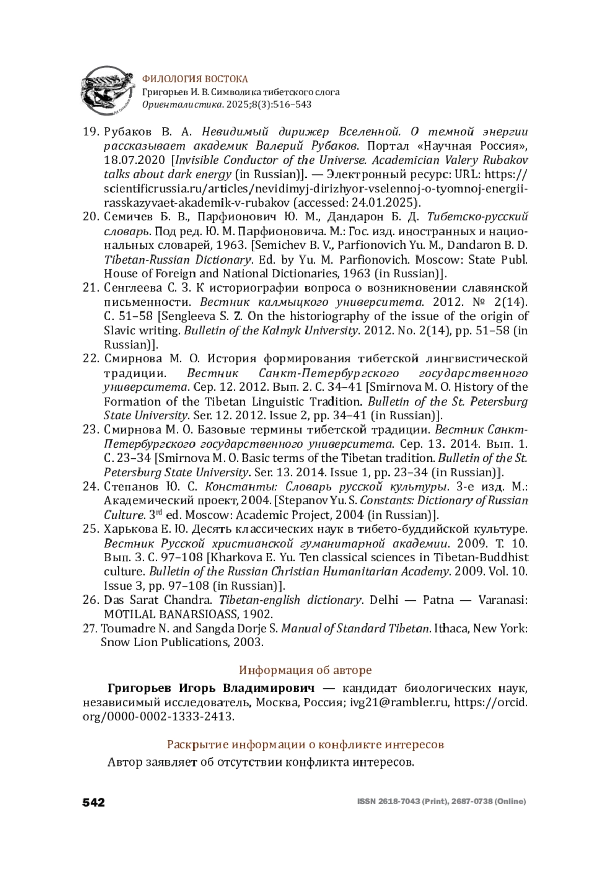 22. Смирнова М. О. История формирования тибетской лингвистической традиции. Вестник Санкт-Петербургского государственного университета. Сер. 12. 2012. Вып. 2. С. 34-41 [Smirnova M. O. History of the Formation of the Tibetan Linguistic Tradition. Bulletin of the St. Petersburg State University. Ser. 12. 2012. Issue 2, pp. 34-41 (in Russian)].