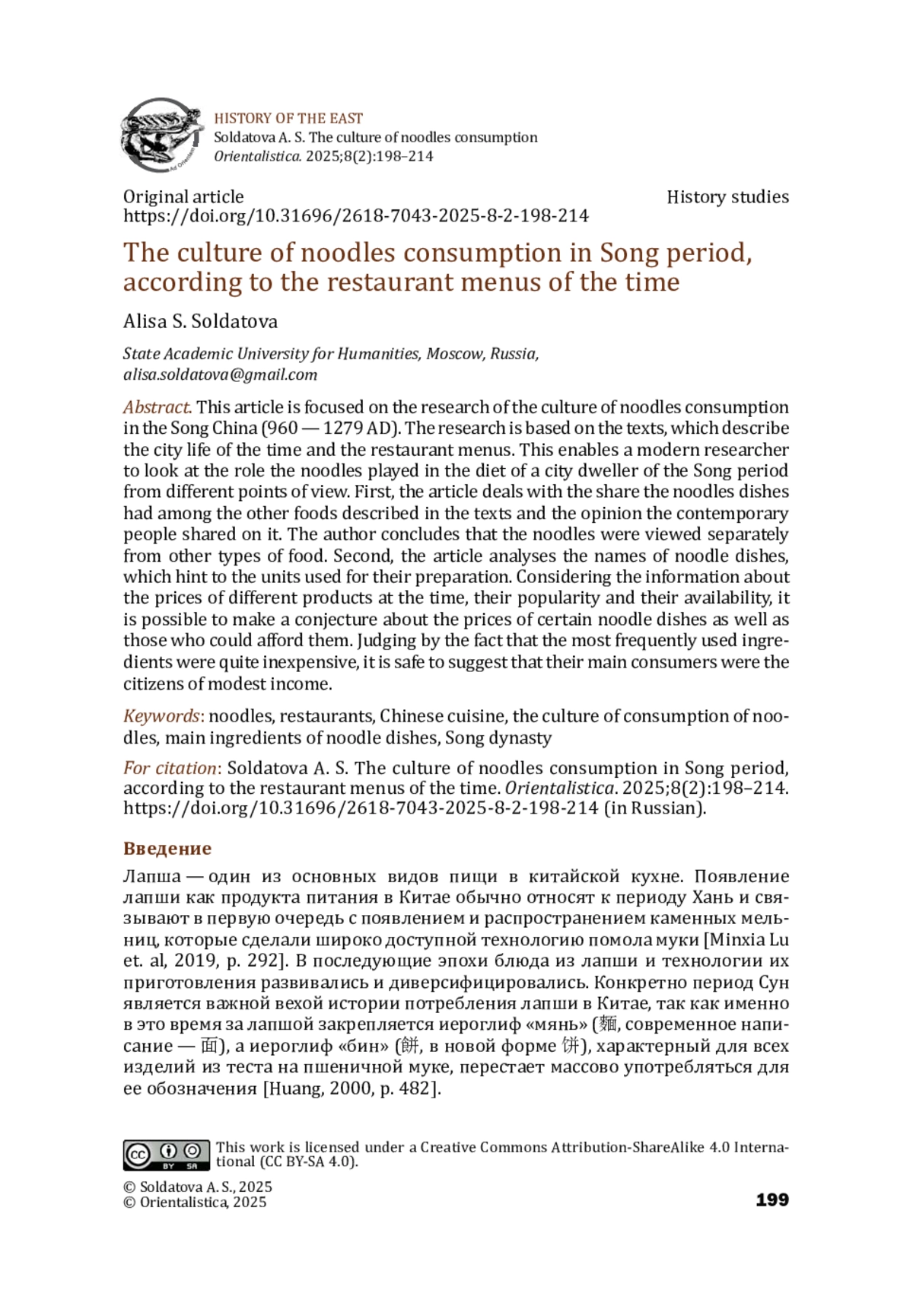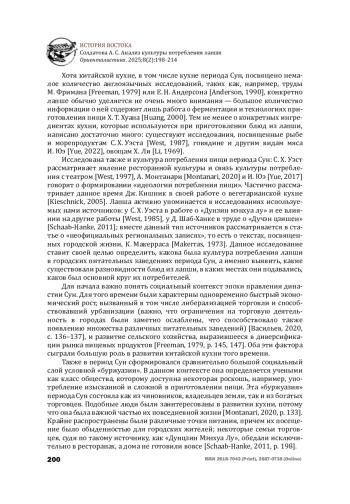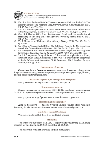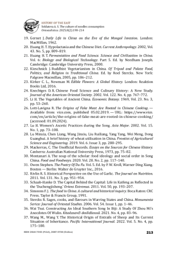18. Freeman M. Sung. Food in Chinese culture. Anthropological and historical perspectives. Ed. by K. C. Chang. London: Yale University Press, 1979, pp. 141-192. 212 ISSN 2618-7043 (Print), 2687-0738 (Online) HISTORY OF THE EAST Soldatova A. S. The culture of noodles consumption Orientalistica. 2025;8(2):198-214.