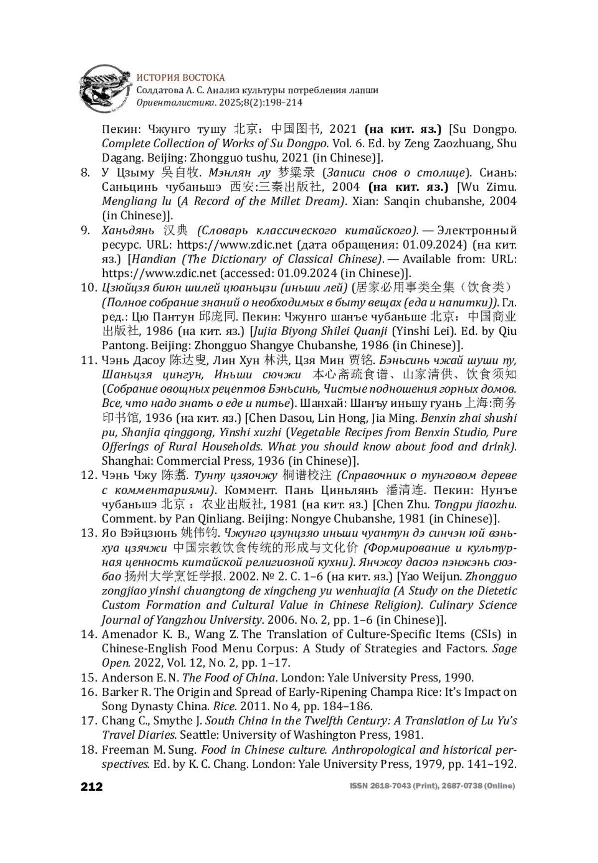 7. Су Дунпо 苏东坡. Су Дунпо цюань цзи лю 苏东坡全集六 (Полное собрание сочинений Су Дунпо. Т. 6). Гл. ред. Цзэн Цзаочжуан 曾枣庄, Шу Даган 舒大刚. ISSN 2618-7043 (Print), 2687-0738 (Online) 211 ИСТОРИЯ ВОСТОКА Солдатова А. С. Анализ культуры потребления лапши Ориенталистика. 2025;8(2):198-214 Пекин: Чжунго тушу 北京 中国图书, 2021 (на кит. яз.) [Su Dongpo.Complete Collection of Works of Su Dongpo. Vol. 6. Ed. by Zeng Zaozhuang, Shu Dagang. Beijing: Zhongguo tushu, 2021 (in Chinese)]. EDN: IFUEWB
