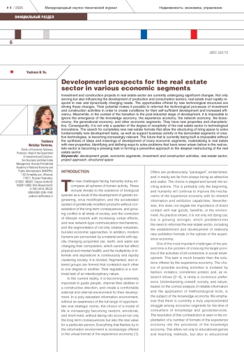 Инвестиционно-строительные проекты в сфере недвижимости переживают в настоящее время существенные изменения. Не только обслуживая, но и оказывая влияние на развитие сферы производства и сферы потребления, недвижимость должна в ускоренном режиме удовлетворять новые, динамично меняющиеся потребности. Источником востребованных изменений становятся возможности нового технологического уклада. Их потенциал позволяет переформатировать технологические процессы инвестиционно-строительной деятельности с целью создания условий ее самодостаточного развития и повышения эффективности. Между тем в условиях перехода к этапу постиндустриального развития невозможно игнорировать становление экономики знаний, экономики впечатлений, сетевой экономики, биоэкономики, поколенческой экономики и других экономических сегментов. Им присущи новые свойства и особенности. Следовательно, речь идет не только о степени восприимчивости сферы недвижимости к технологическим инновациям. Актуализируется поиск совершенно новых форматов недвижимости, позволяющих структурировать пространство жизнедеятельности для решения принципиально новых задач развития, а также поддержки деловой активности в востребованных сегментах креативных технологий. Выстраиваемое в настоящее время будущее невозможно без синтеза идей и смыслов развития множества экономических сегментов, материализующихся в недвижимости с новыми свойствами. Выявление и определение путей решения никогда ранее не возникавших проблем в сфере недвижимости становится актуальной задачей формирования превентивного подхода к глубочайшей реструктуризации сферы недвижимости.