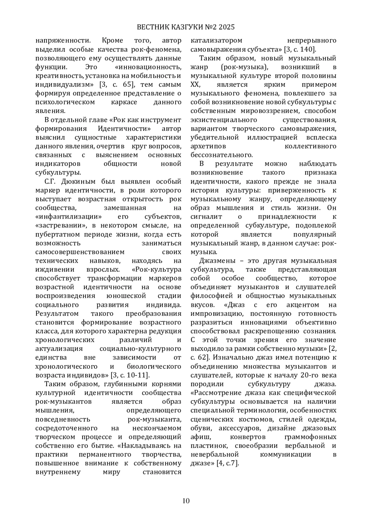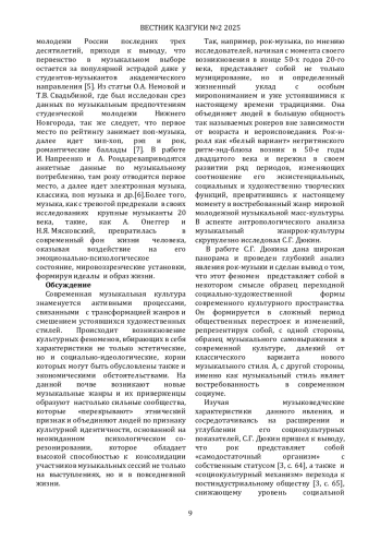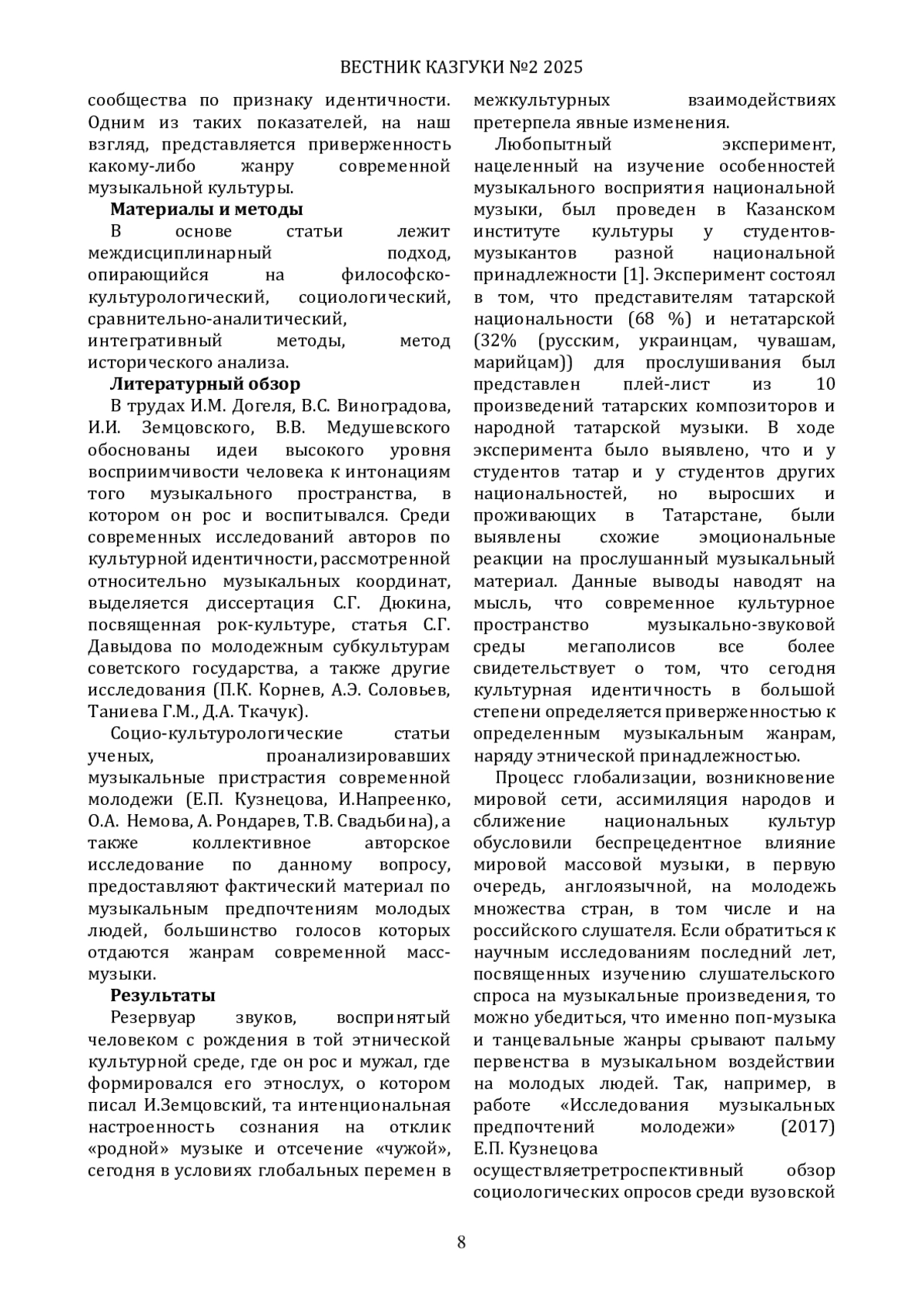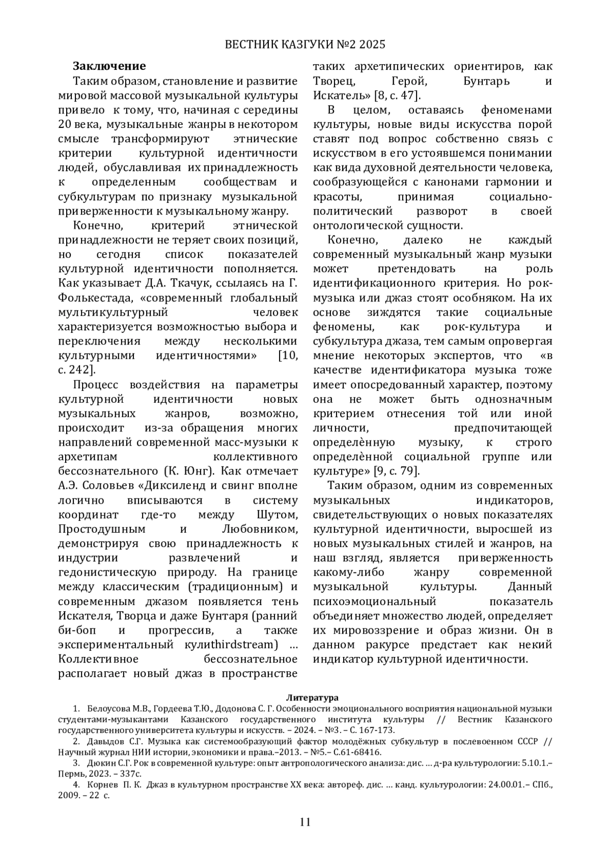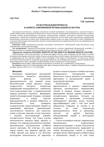 Культурная идентичность, основные показатели которой исторически согласовываются с единством языка и тембра музыкальных инструментов (певческого голоса) в реалиях современной музыкальной культуры, которая в большей степени репрезентирована массовыми музыкальными жанрами, дополняется новыми показателями, связанными с общностью жизненных маршрутов представителей тех или иных новых музыкальных направлений. Музыкальная увлеченность каким-либо музыкальным жанром влияет на образ мышления и может формировать отдельные субкультуры, объединяющие людей по такому параметру культурной идентичности, как приверженность музыкальному жанру.