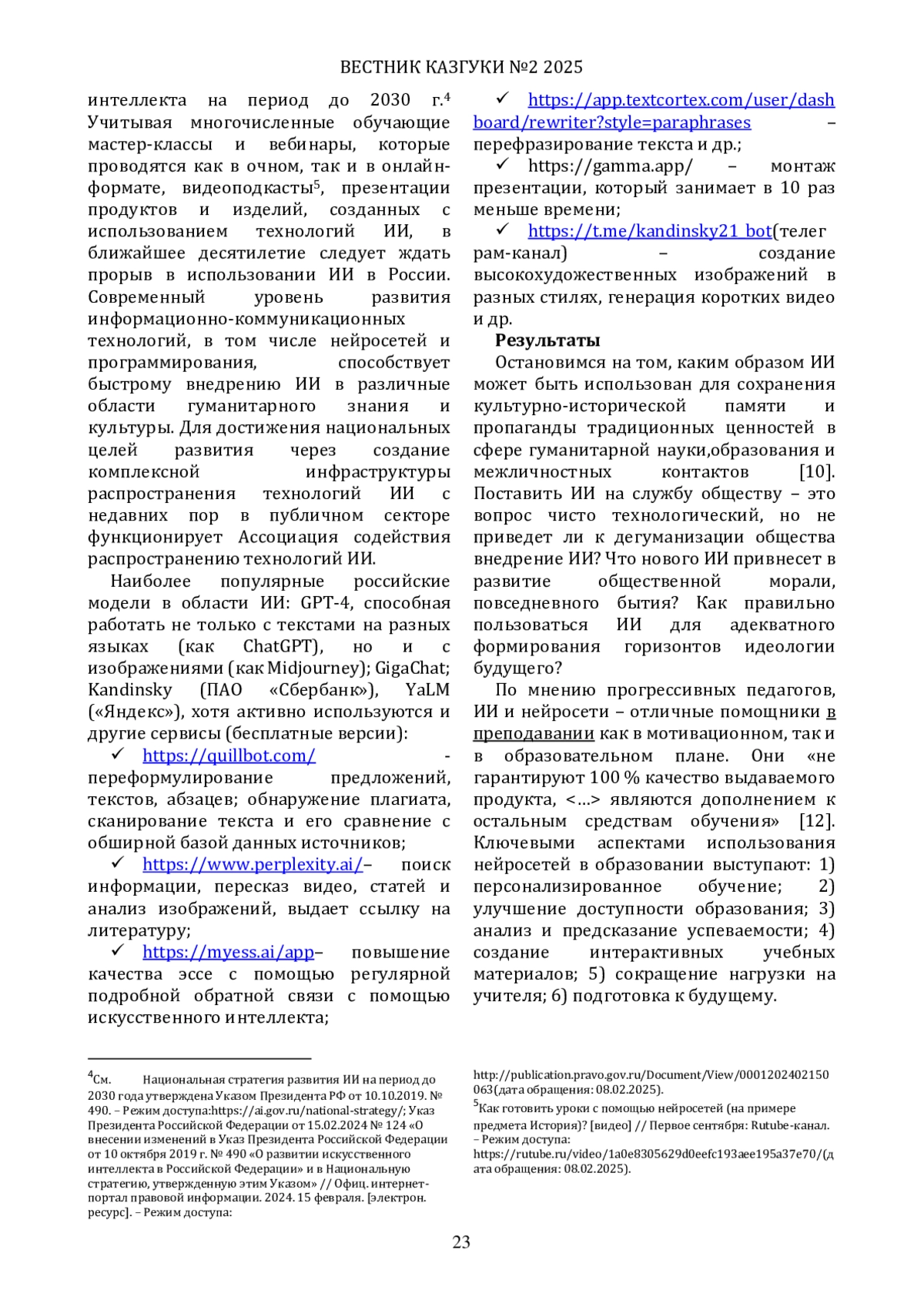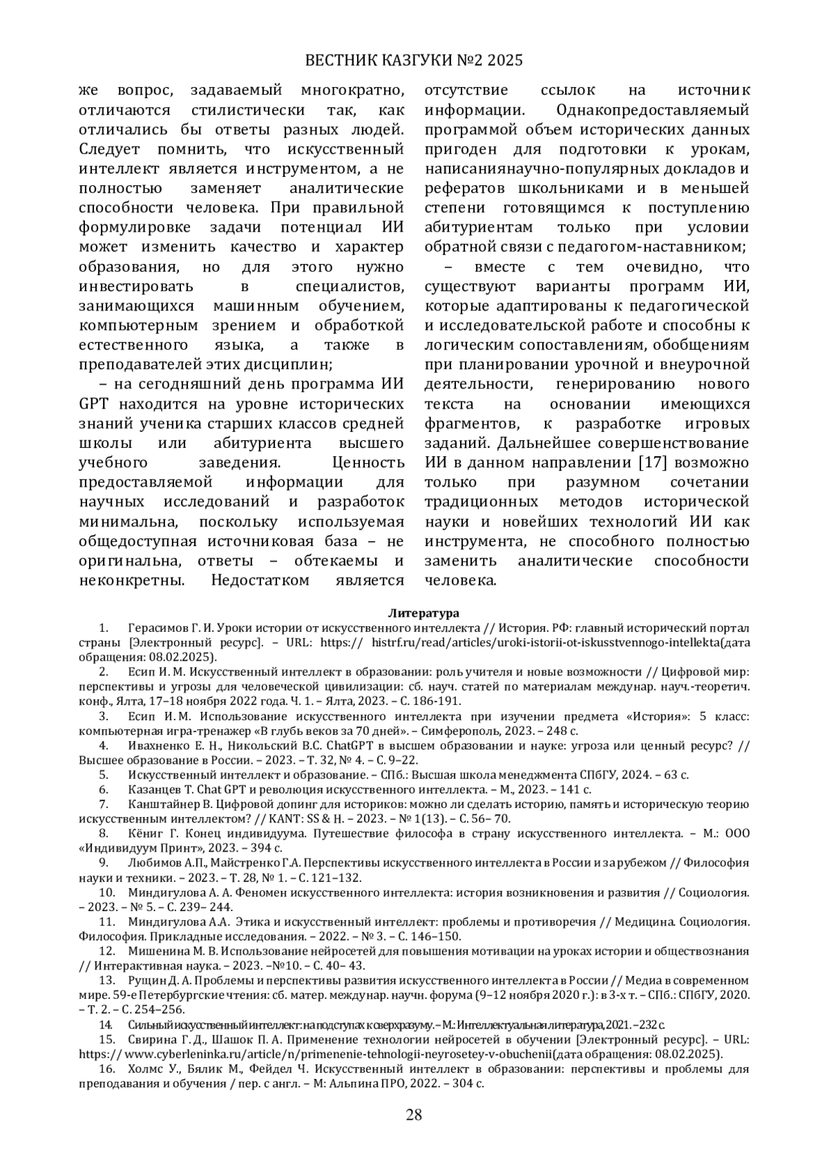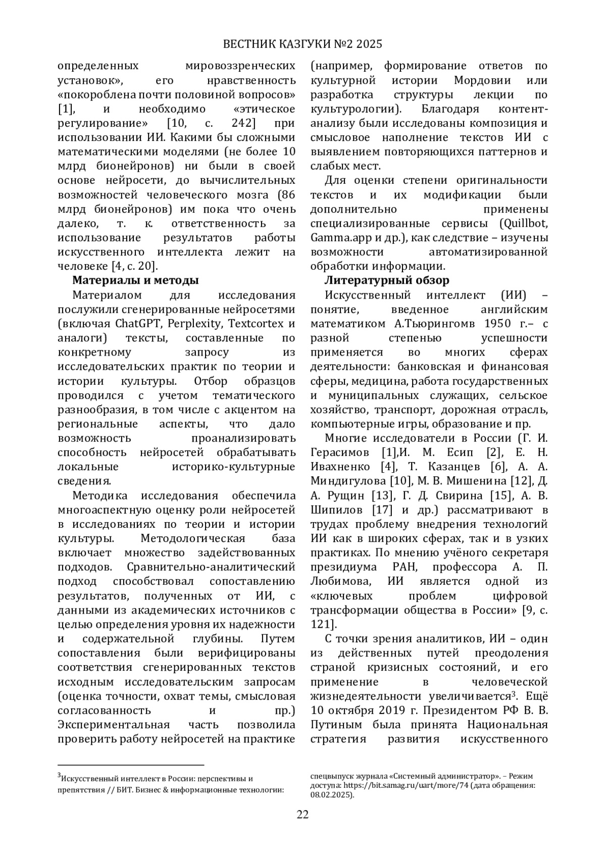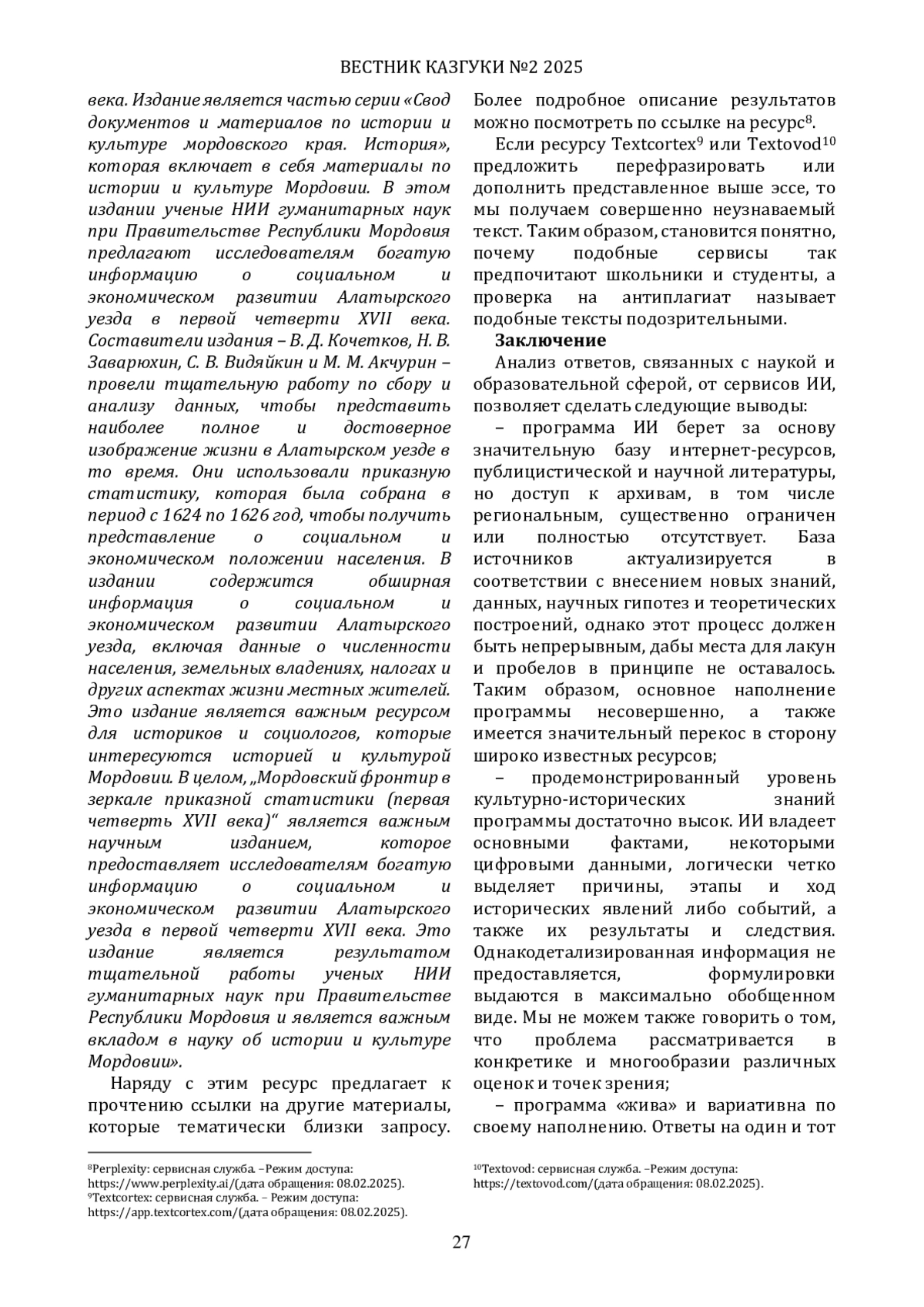 Цель работы - проанализировать на конкретных примерах возможности нейросетей (ChatGPT, Perplexity, Textcortex и др.) в отношении организации учебных занятий по истории и культуре, научной деятельности и исследовательских практик. Освещены как позитивные аспекты использования ИИ (повышение доступности образования, персонализация обучения, сокращение временных затрат на подготовку материалов и др.), так и вызовы (ограниченная глубина анализа исторических процессов, недостаточная точность при работе с региональными источниками, этические дилеммы). Особое внимание уделено текущему состоянию развития ИИ в России, стратегическим направлениям его внедрения в гуманитарную сферу и их практическому влиянию. Авторы подчеркивают необходимость синтеза традиционных методов исторической науки и современных технологий для более эффективного изучения и сохранения культурно-исторического наследия.