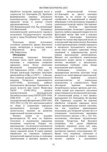 3. Булгаков В. Д. Песня - ведущий жанр хоровой музыки татарских композиторов // Вестник Казанского государственного университета культуры и искусств. - 2012. - № 2. - С. 84-87. EDN: OYFKAV