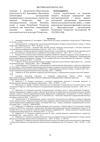 11. Мингазова Л. П. Жанры татарских народных песен в репертуаре Государственного Ансамбля песни и танца Республики Татарстан // Вестник Казанского государственного университета культуры и искусств. - 2020. - № 1. - С. 116-120. EDN: WAHLNJ