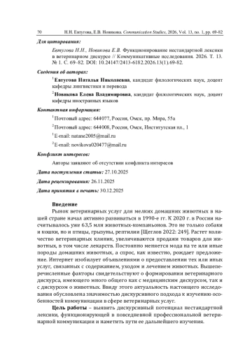 Рынок ветеринарных услуг для мелких домашних животных в нашей стране начал активно развиваться в 1990-е гг. К 2020 г. в России насчитывалось уже 63,5 млн животных-компаньонов. Это не только собаки и кошки, но и птицы, грызуны, рептилии [Щеглов 2022: 249]. Растет количество ветеринарных клиник, увеличиваются продажи товаров для животных, в том числе лекарств. Постоянно меняется мода на те или иные породы домашних животных, а спрос, как известно, рождает предложение. Интернет изобилует объявлениями о предоставлении тех или иных услуг, связанных с содержанием, уходом и лечением животных. Вышеперечисленные факторы свидетельствуют о формировании ветеринарного дискурса, имеющего много общего как с медицинским дискурсом, так и с дискурсом о животных. Ввиду этого актуальность настоящего исследования обусловлена значимостью дискурсивного подхода к изучению особенностей коммуникации в сфере ветеринарных услуг.