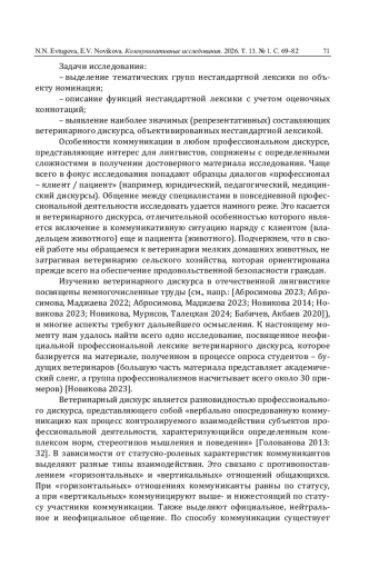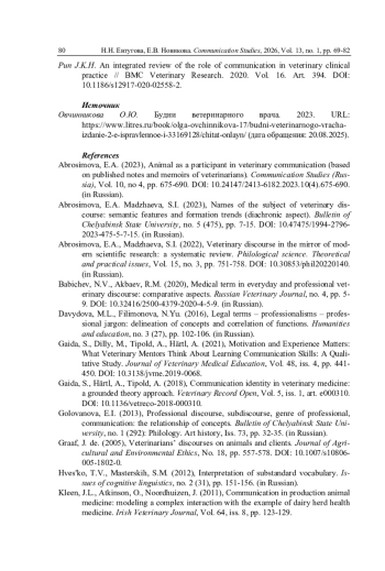 2. Абросимова Е.А., Маджаева С.И. Наименования субъекта ветеринарного дискурса: семантические особенности и тенденции формирования (диахронический аспект) // Вестник Челябинского государственного университета. 2023. № 5 (475). С. 7-15. DOI: 10.47475/1994-2796-2023-475-5-7-15
