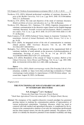 7. Новикова О.Н. Неофициальная профессиональная лексика ветеринарного дискурса // Доклады Башкирского университета. 2023. Т. 8. № 2. С. 84-91. DOI: 10.33184/dokbsu-2023.2.11 EDN: UJIYAH