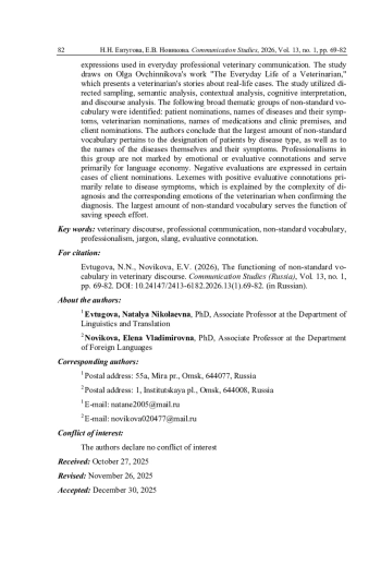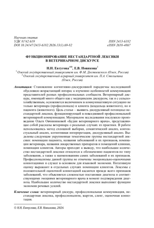 Становление когнитивно-дискурсивной парадигмы исследований обусловило возрастающий интерес к изучению особенностей коммуникации представителей разных профессиональных сообществ. Ветеринарный дискурс, имеющий много общего как с медицинским дискурсом, так и с сельскохозяйственным, осложняется включением в коммуникативную ситуацию не только ветеринара (профессионала) и клиента (владельца животного), но и пациента (животного). Цель статьи - выявить дискурсивный потенциал нестандартной лексики, функционирующей в повседневной профессиональной ветеринарной коммуникации. Материалом исследования послужило произведение Ольги Овчинниковой «Будни ветеринарного врача», представляющее собой рассказы ветеринара о реальных случаях из практики. В работе использовались метод сплошной выборки, семантический анализ, контекстуальный анализ, когнитивная интерпретация, дискурсивный анализ. Выделены следующие укрупненные тематические группы нестандартной лексики: номинации пациента, названия заболеваний и их признаков, номинации ветеринара, названия лекарственных препаратов и помещений клиники, номинации клиентов. Авторы приходят к выводу, что наибольшее количество нестандартной лексики относится к обозначению пациентов по типу заболевания, а также к наименованиям самих заболеваний и их признаков. Профессионализмы данной группы не отмечены эмоционально-оценочными коннотациями и служат в основном для языковой экономии. Негативную оценку выражают в отдельных случаях номинации клиентов. Лексемы с положительной оценочной коннотацией касаются прежде всего признаков заболеваний, что объясняется сложностью постановки диагноза и соответствующими эмоциями ветеринарного врача в момент подтверждения диагноза. Наибольшее количество нестандартной лексики выполняет функцию экономии речевых усилий