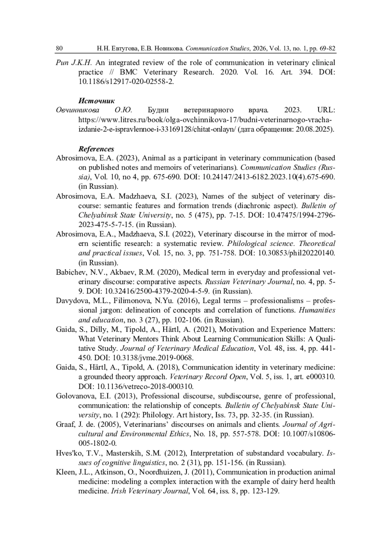1. Абросимова Е.А. Животное как участник ветеринарной коммуникации (на материале опубликованных записок и воспоминаний ветеринарных врачей) // Коммуникативные исследования. 2023. Т. 10. № 4. С. 675-690. DOI: 10.24147/2413-6182.2023.10(4).675-690 EDN: NMTHIO