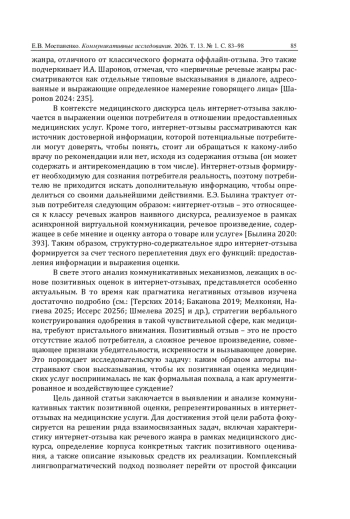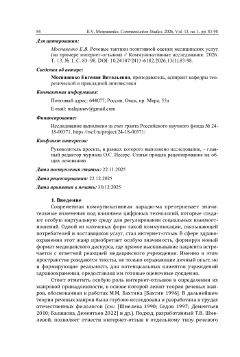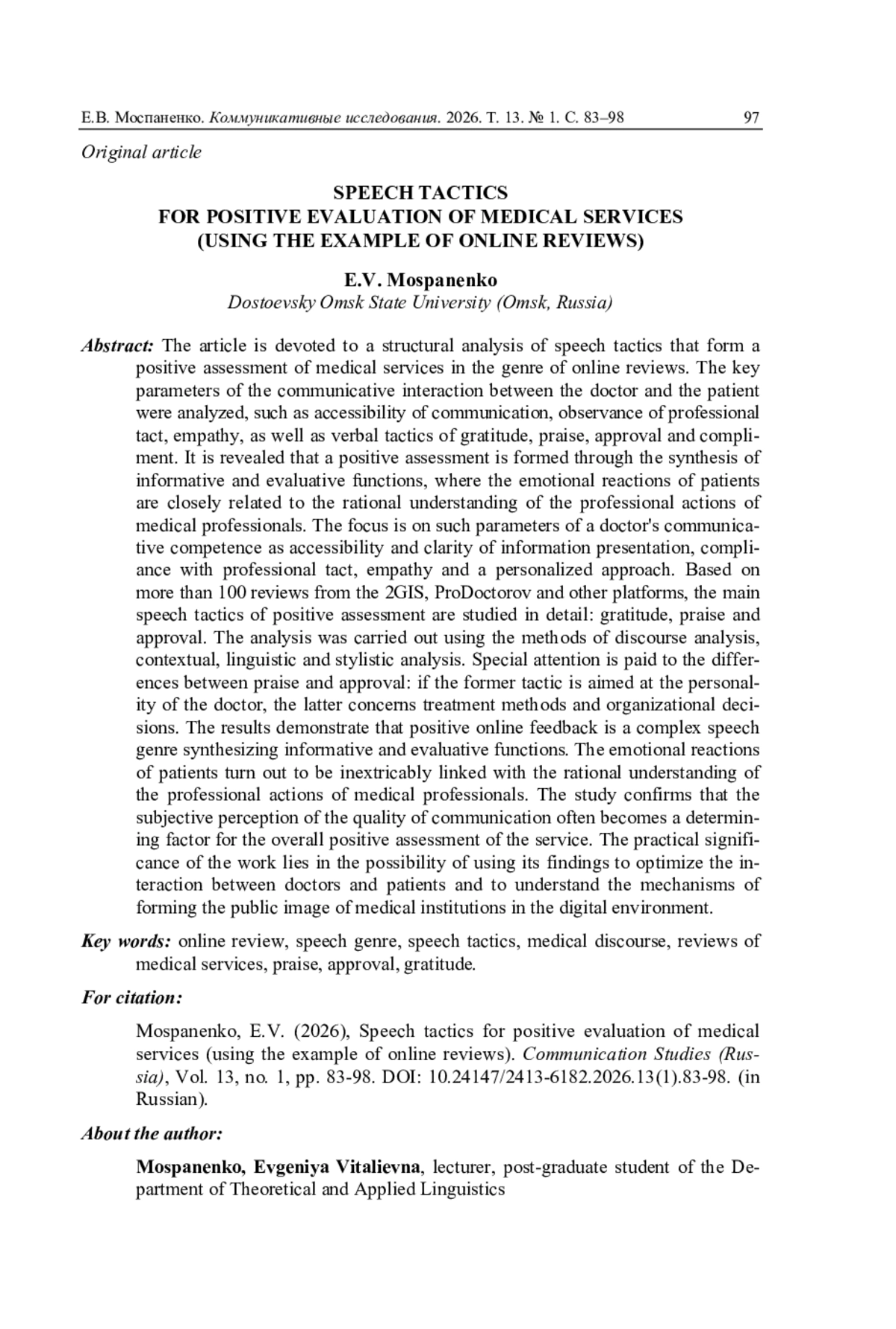 Статья посвящена структурному анализу речевых тактик, формирующих позитивную оценку медицинских услуг в жанре интернет-отзывов. Были проанализированы ключевые параметры коммуникативного взаимодействия врача и пациента, такие как доступность коммуникации, соблюдение профессионального такта, эмпатия, а также речевые тактики благодарности, похвалы и одобрения. Выявлено, что позитивная оценка формируется через синтез информативной и оценочной функций, где эмоциональные реакции пациентов тесно связаны с рациональным осмыслением профессиональных действий медицинских работников. В центре внимания находятся такие параметры коммуникативной компетенции врача, как доступность и понятность изложения информации, соблюдение профессионального такта, проявление эмпатии и персонализированный подход. На материале более 100 отзывов с платформ 2ГИС, «ПроДокторов» и др. детально исследуются основные речевые тактики позитивного оценивания: благодарность, похвала и одобрение. Анализ осуществлялся с привлечением методов дискурс-анализа, контекстуального, лингвостилистического анализа. Особое внимание уделяется различиям между похвалой и одобрением: если первая тактика направлена на личность врача, то вторая касается методов лечения и организационных решений. Результаты демонстрируют, что позитивный интернет-отзыв представляет собой сложный речевой жанр, синтезирующий информативную и оценочную функции. Эмоциональные реакции пациентов оказываются неразрывно связаны с рациональным осмыслением профессиональных действий медицинских работников. Исследование подтверждает, что субъективное восприятие качества коммуникации зачастую становится определяющим фактором для общей положительной оценки услуги. Практическая значимость работы заключается в возможности использования ее выводов для оптимизации взаимодействия между врачами и пациентами и понимания механизмов формирования публичного имиджа медицинских учреждений в цифровой среде
