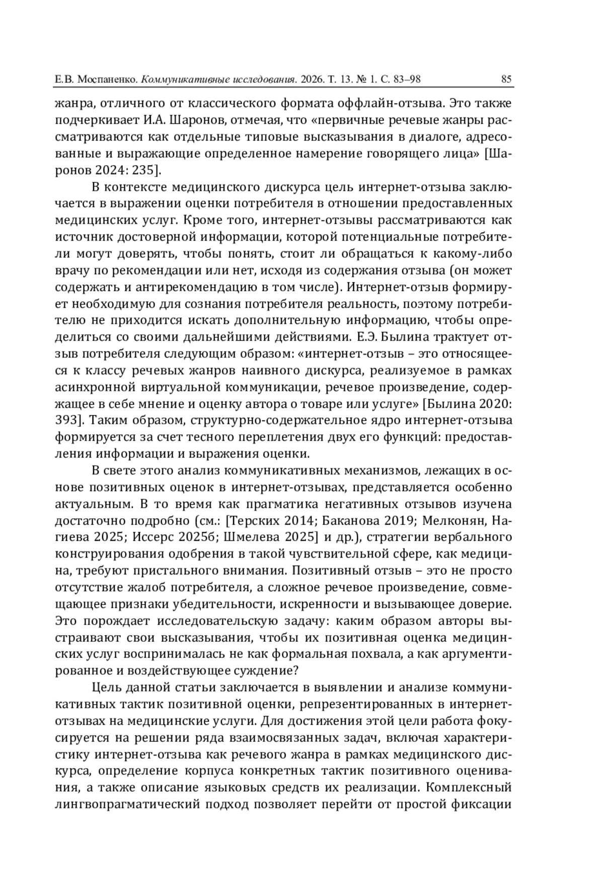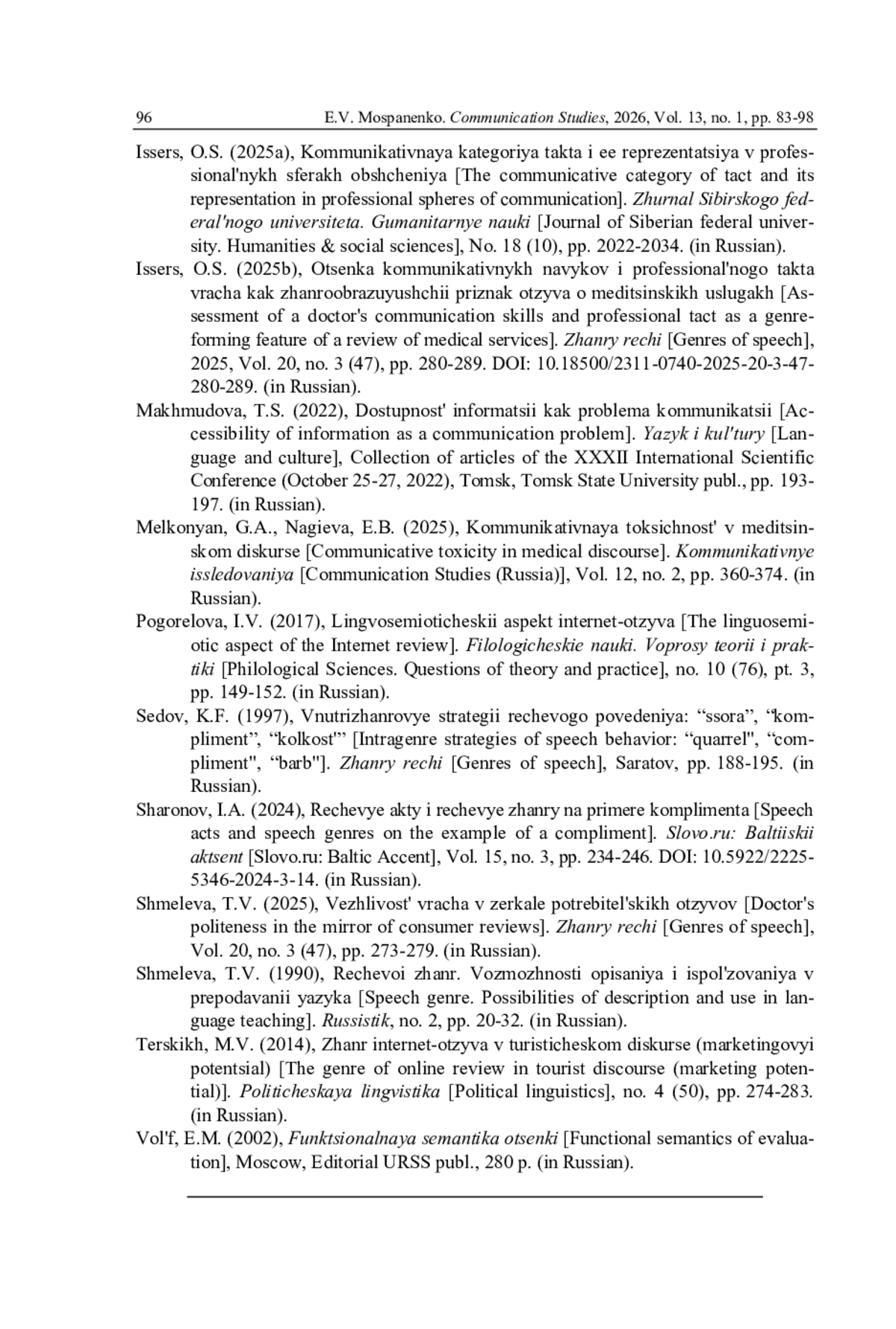 9. Иссерс О.С. Оценка коммуникативных навыков и профессионального такта врача как жанрообразующий признак отзыва о медицинских услугах // Жанры речи. 2025б. Т. 20. № 3 (47). С. 280-289. DOI: 10.18500/2311-0740-2025-20-3-47-280-289 EDN: OSZZIV