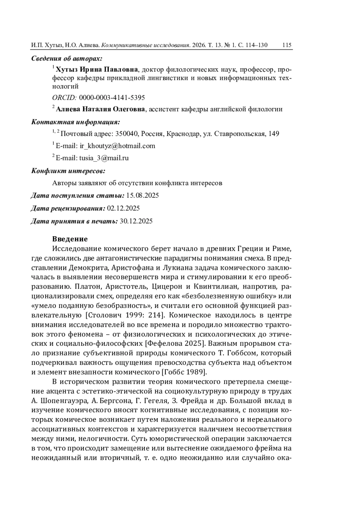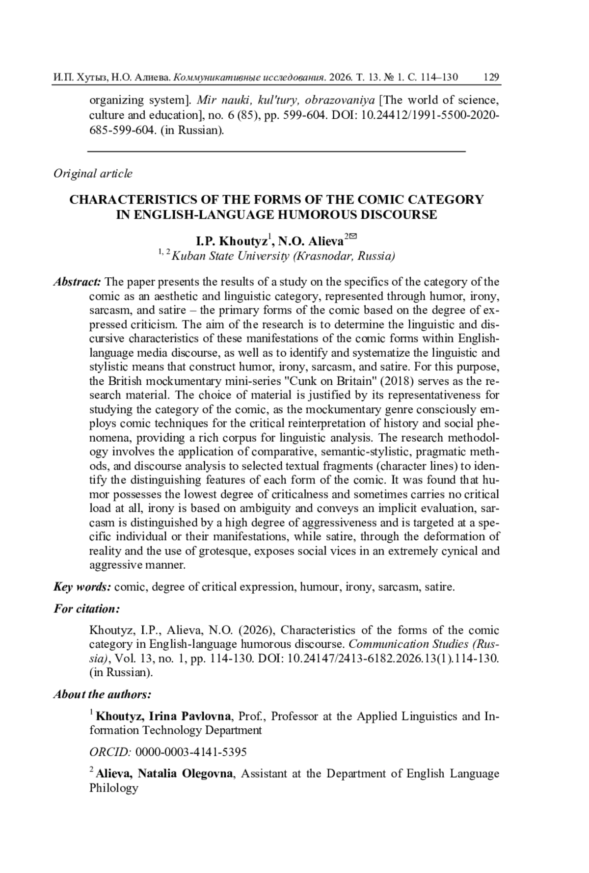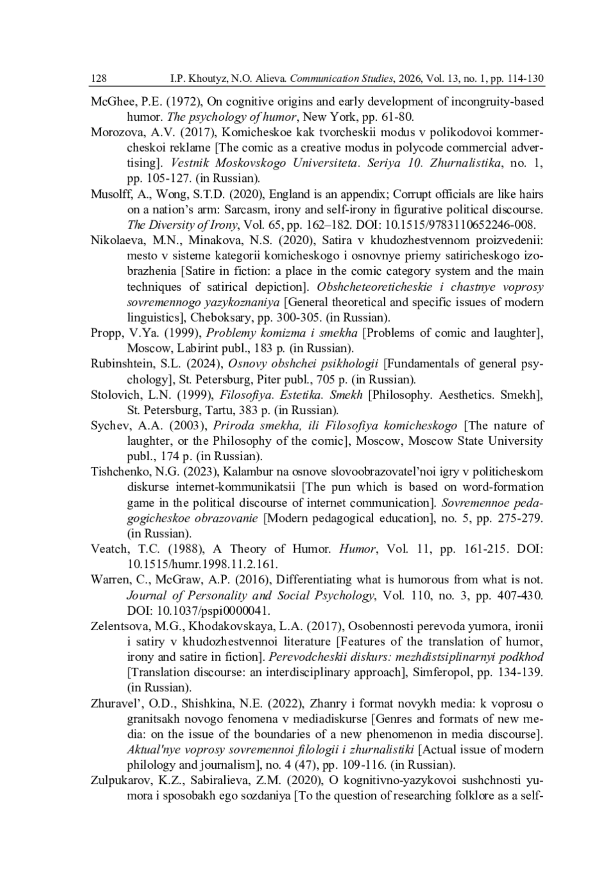 20. Фефелова Г.Г. Языковые и культурные коды в репрезентации категории комического // Филология и культура. 2025. № 2 (80). С. 78-86.