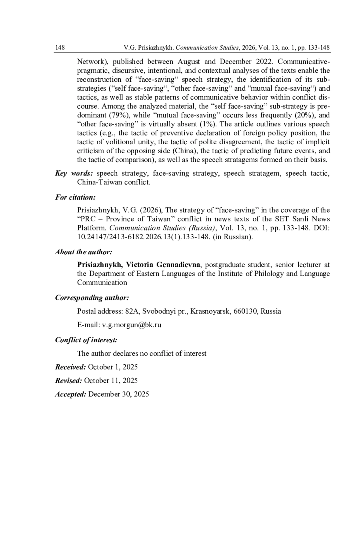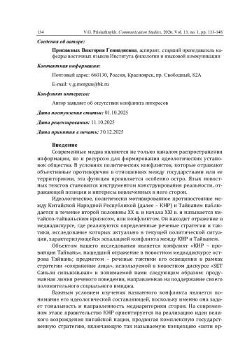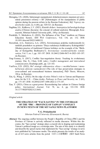 Современный конфликт между КНР и провинцией Тайвань находит отражение в медиадискурсе. Используемая в нем стратегия «сохранения лица» играет ключевую роль в формировании и поддержании политического имиджа Тайваня как суверенного государства. В статье представлено описание речевых тактик, реализующих стратегию «сохранения лица» в новостных текстах тайваньских СМИ; выводы сделаны на основе анализа речевого материала, включающего 615 новостных текстов портала «SET Саньли синьвэньван», которые были опубликованы в августе-декабре 2022 г. Коммуникативно-прагматический, дискурсивный, интенциональный и контекстологический анализы текстов позволили реконструировать речевую стратегию «сохранения лица», выделить ее субстратегии («сохранение собственного лица», «сохранение лица другого» и «сохранение коллективного лица») и тактики, а также устойчивые модели речевого поведения в конфликтной коммуникации. В проанализированном материале преобладает субстратегия «сохранение собственного лица» (она выявлена в 79 % текстов); субстратегия «сохранение коллективного лица» встречается в 20 % текстов; «сохранение лица другого» практически не представлена - 1 % текстов. Описаны речевые тактики (тактика превентивной декларации внешнеполитической позиции, тактика волевого единства, тактика вежливого несогласия, тактика скрытой критики противоборствующей стороны - Китая, тактика предсказания будущих событий, тактика сопоставления), а также формирующиеся на их основе речевые стратагемы