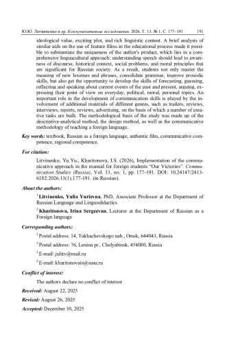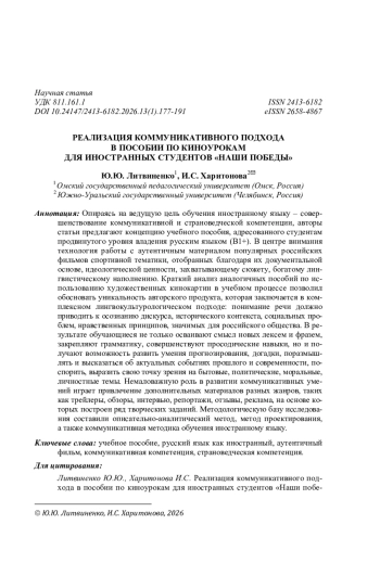 Опираясь на ведущую цель обучения иностранному языку - совершенствование коммуникативной и страноведческой компетенции, авторы статьи предлагают концепцию учебного пособия, адресованного студентам продвинутого уровня владения русским языком (В1+). В центре внимания технология работы с аутентичным материалом популярных российских фильмов спортивной тематики, отобранных благодаря их документальной основе, идеологической ценности, захватывающему сюжету, богатому лингвистическому наполнению. Краткий анализ аналогичных пособий по использованию художественных кинокартин в учебном процессе позволил обосновать уникальность авторского продукта, которая заключается в комплексном лингвокультурологическом подходе: понимание речи должно приводить к осознанию дискурса, исторического контекста, социальных проблем, нравственных принципов, значимых для российского общества. В результате обучающиеся не только осваивают смысл новых лексем и фразем, закрепляют грамматику, совершенствуют просодические навыки, но и получают возможность развить умения прогнозирования, догадки, поразмышлять и высказаться об актуальных событиях прошлого и современности, поспорить, выразить свою точку зрения на бытовые, политические, моральные, личностные темы. Немаловажную роль в развитии коммуникативных умений играет привлечение дополнительных материалов разных жанров, таких как трейлеры, обзоры, интервью, репортажи, отзывы, реклама, на основе которых построен ряд творческих заданий. Методологическую базу исследования составили описательно-аналитический метод, метод проектирования, а также коммуникативная методика обучения иностранному языку.