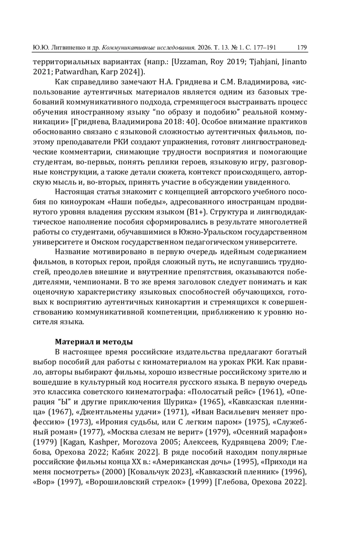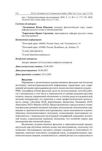 Обращение к аутентичным художественным фильмам как богатому источнику лингвострановедческой информации характерно для современной методики преподавания русского языка как иностранного (далее – РКИ). Специфика отбора фильмов, цели их использования, способы работы с материалом, в том числе в зависимости от уровня владения русским языком, модели упражнений обозначены в статьях ряда исследователей, активно внедряющих эту практику в свою профессиональную деятельность (напр.: [Летцбор 2018; Березняцкая, Денисенко, Калинина 2019; Лавочкина 2023; Ивкина 2025]).
