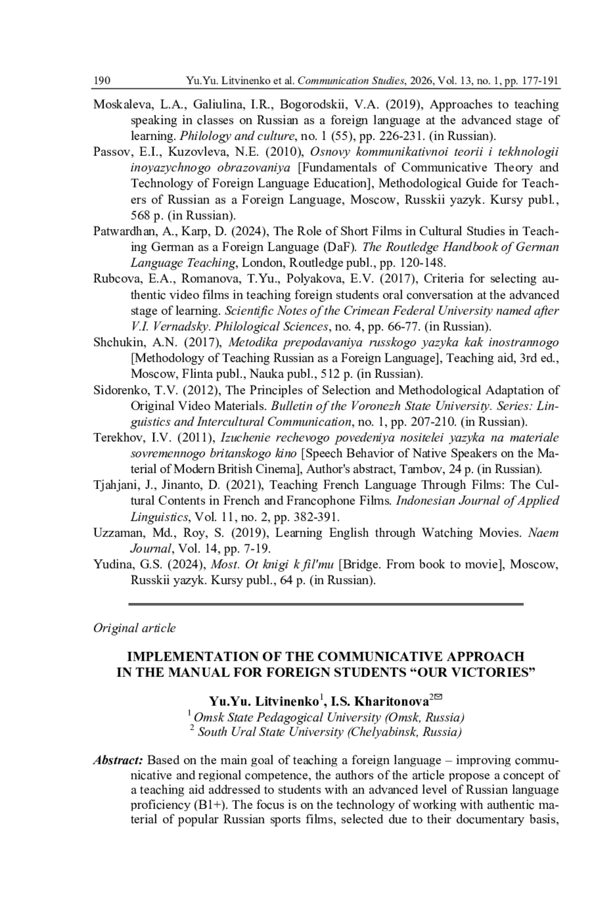 16. Летцбор К.В. Отечественное киноискусство в обучении русскому как иностранному // Вестник Пермского национального исследовательского политехнического университета. Проблемы языкознания и педагогики. 2018. № 1. С. 168-176.