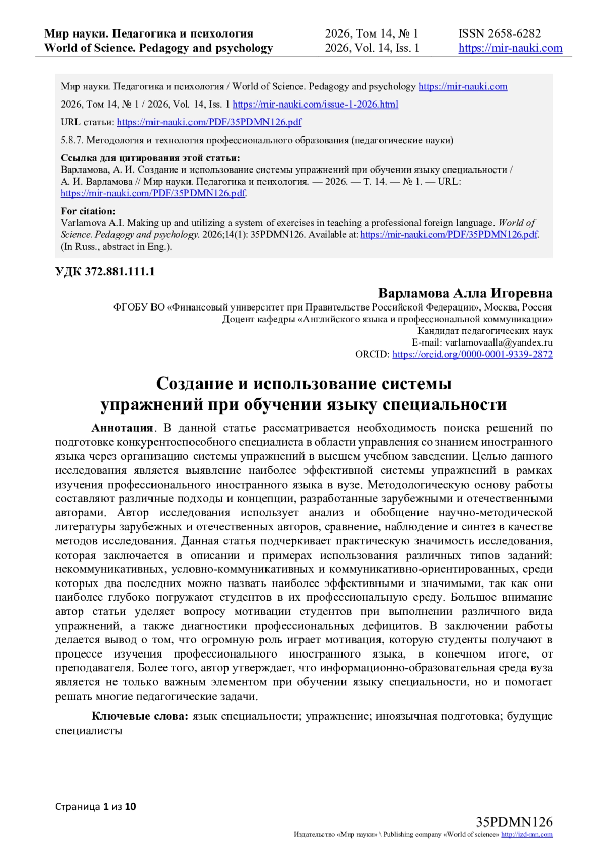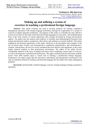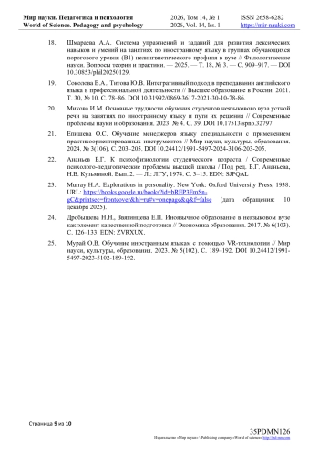 18. Шмараева А.А. Система упражнений и заданий для развития лексических навыков и умений на занятиях по иностранному языку в группах обучающихся порогового уровня (B1) нелингвистического профиля в вузе // Филологические науки. Вопросы теории и практики. — 2025. — Т. 18, № 3. — С. 909–917. — DOI 10.30853/phil20250129.