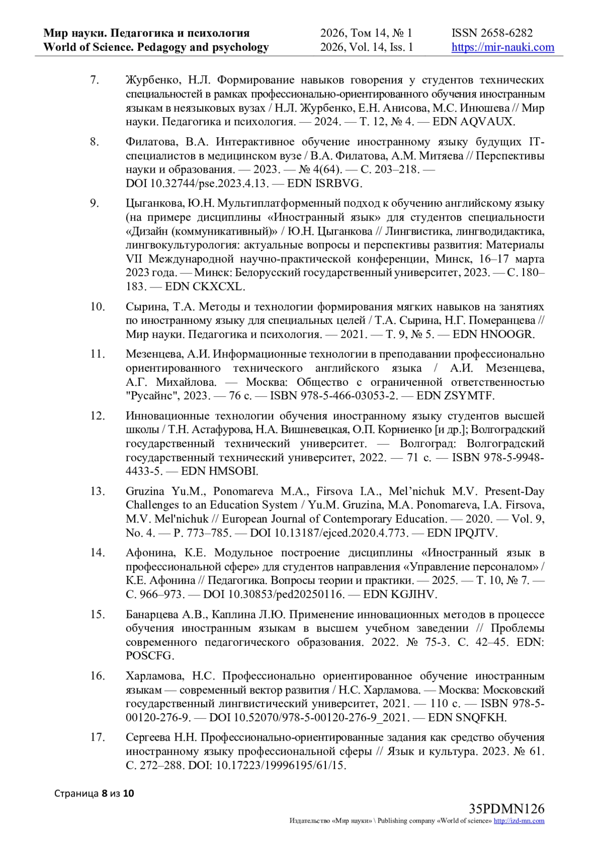 7. Журбенко, Н.Л. Формирование навыков говорения у студентов технических специальностей в рамках профессионально-ориентированного обучения иностранным языкам в неязыковых вузах / Н.Л. Журбенко, Е.Н. Анисова, М.С. Инюшева // Мир науки. Педагогика и психология. — 2024. — Т. 12, № 4. — EDN AQVAUX.