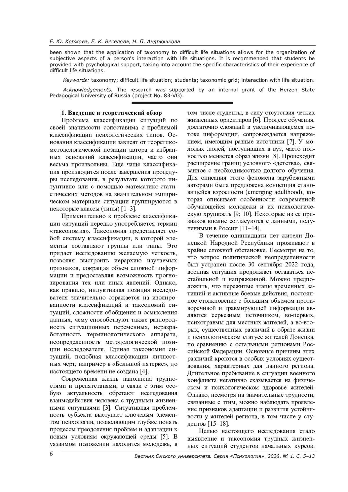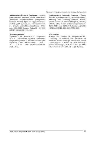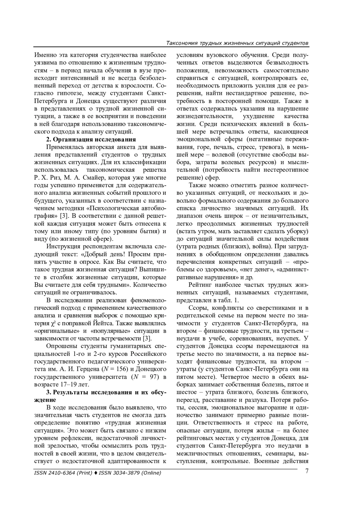 Таксономия жизненных ситуаций является актуальной проблемой ситуационного подхода, позволяя упорядочить сведения о значимых жизненных ситуациях. Студенты переживают многие жизненные трудности, количество которых растет в современном мире. Кроме того, в разных регионах в силу объективных причин возможны разные жизненные ситуации. В статье реализован феноменологический подход с применением качественного анализа и сравнения выборок с помощью критерия χ² с поправкой Йейтса. Целью исследования стало определение таксономии трудных жизненных ситуаций студентов Санкт-Петербурга и Донецка. На основе данных анкетирования осуществлялся контент-анализ, а также использовалась модифицированная для методики «Психологическая автобиография» Е. Ю. Коржовой таксономическая решетка Р. Х. Риз и М. А. Смайер. В исследовании приняли участие 156 студентов Санкт-Петербурга и 97 студентов Донецка гуманитарного профиля 1-го и 2-го курсов в возрасте 17-19 лет. Выявлены сходства и различия в перечнях трудных жизненных ситуаций студентов. Так, на первом месте у всех студентов трудные ситуации в области межличностных отношений. Студенты Санкт-Петербурга в большей степени склонны к самоорганизации и контролю ситуации, студенты Донецка уделяют больше внимания психологическим аспектам и внутреннему комфорту. «Популярные» ситуации (указанные не менее чем 30 % респондентов) одинаковы для обеих выборок (болезнь, болезнь близкого, финансовые трудности). Показано, что применение таксономии к трудным жизненным ситуациям позволяет упорядочить субъективные аспекты взаимодействия человека с ними. Рекомендовано психологическое сопровождение студентов с учетом значимости для них трудных жизненных ситуаций.