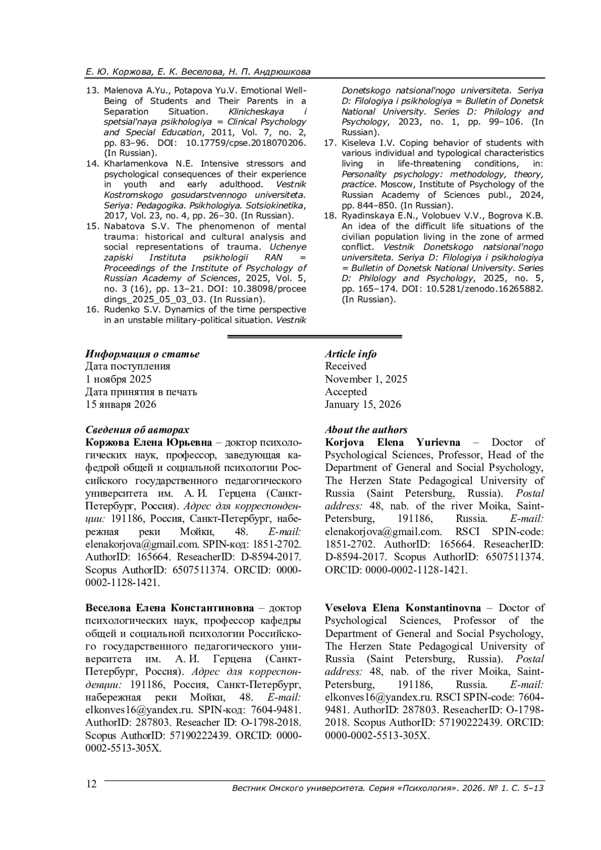 18. Рядинская Е. Н., Волобуев В. В., Богрова К. Б. Представление о сложных жизненных ситуациях гражданского населения, проживающего в зоне вооруженного конфликта // Вестник Донецкого университета. Серия Д: Филология и психология. - 2025. - № 5. - С. 165-174. -. DOI: 10.5281/zenodo.16265882