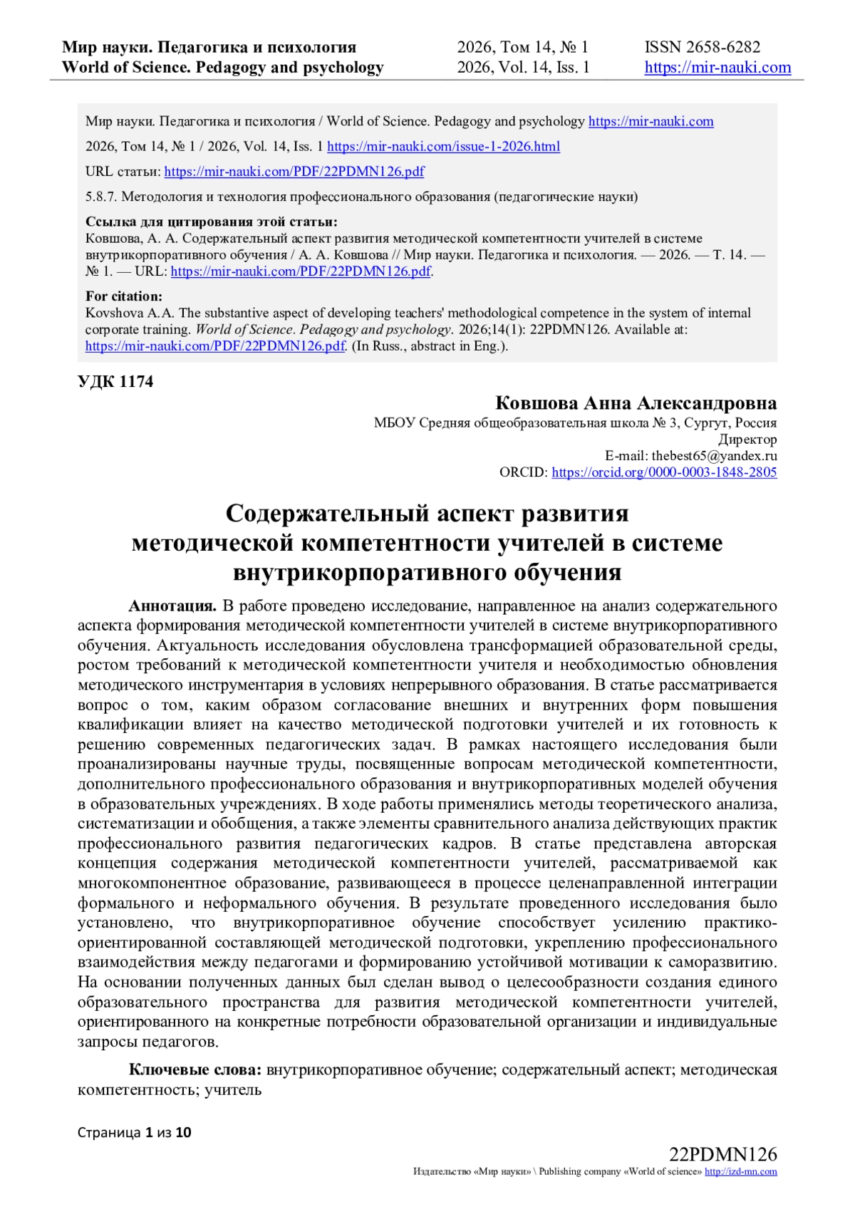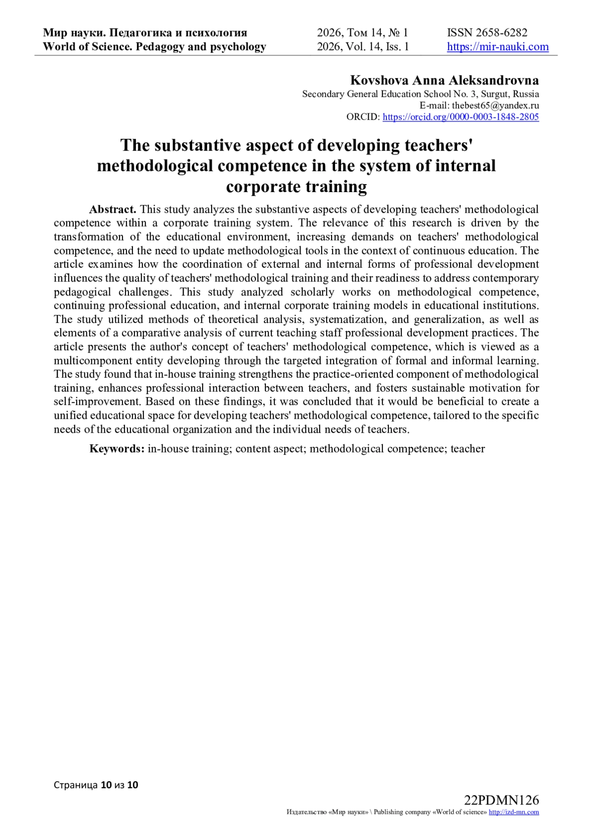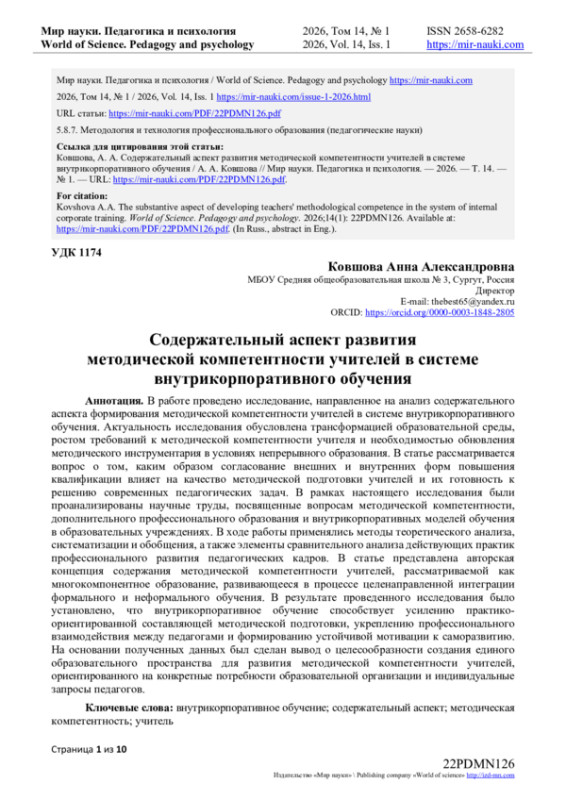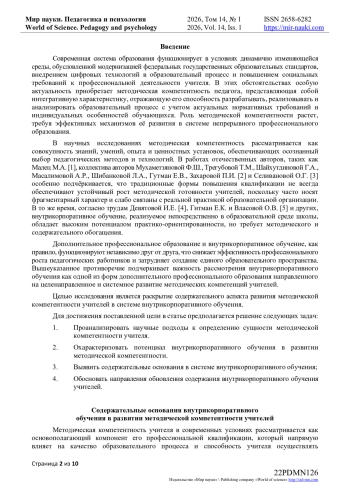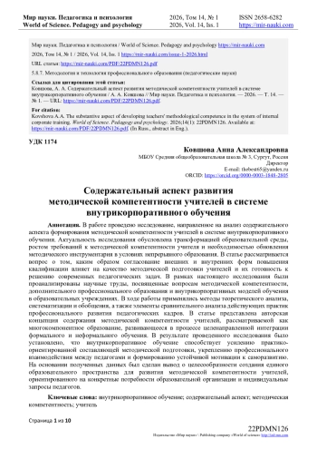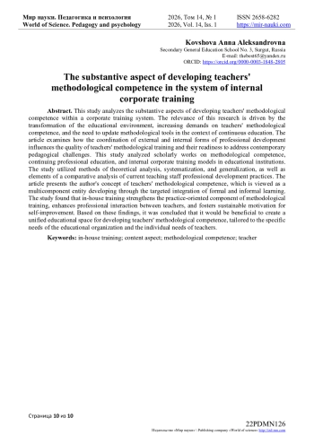 В работе проведено исследование, направленное на анализ содержательного аспекта формирования методической компетентности учителей в системе внутрикорпоративного обучения. Актуальность исследования обусловлена трансформацией образовательной среды, ростом требований к методической компетентности учителя и необходимостью обновления методического инструментария в условиях непрерывного образования. В статье рассматривается вопрос о том, каким образом согласование внешних и внутренних форм повышения квалификации влияет на качество методической подготовки учителей и их готовность к решению современных педагогических задач. В рамках настоящего исследования были проанализированы научные труды, посвященные вопросам методической компетентности, дополнительного профессионального образования и внутрикорпоративных моделей обучения в образовательных учреждениях. В ходе работы применялись методы теоретического анализа, систематизации и обобщения, а также элементы сравнительного анализа действующих практик профессионального развития педагогических кадров. В статье представлена авторская концепция содержания методической компетентности учителей, рассматриваемой как многокомпонентное образование, развивающееся в процессе целенаправленной интеграции формального и неформального обучения.