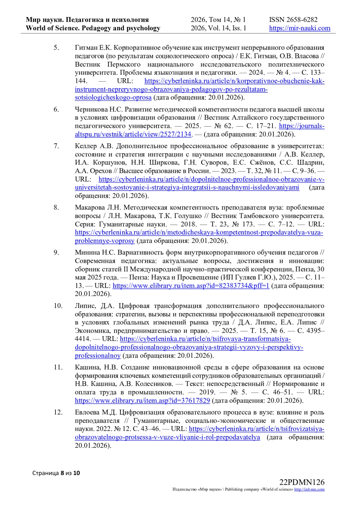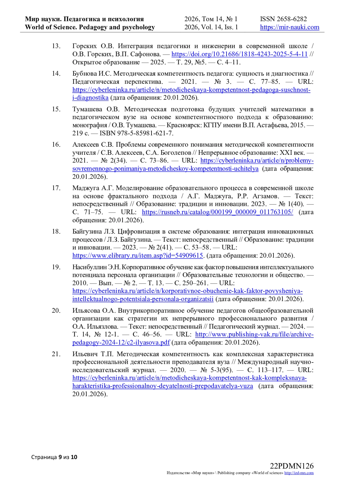6. Черникова Н.С. Развитие методической компетентности педагога высшей школы в условиях цифровизации образования // Вестник Алтайского государственного педагогического университета. — 2025. — № 62. — С. 17–21. https://journalsaltspu.ru/vestnik/article/view/2527/2134. — (дата обращения: 20.01.2026).