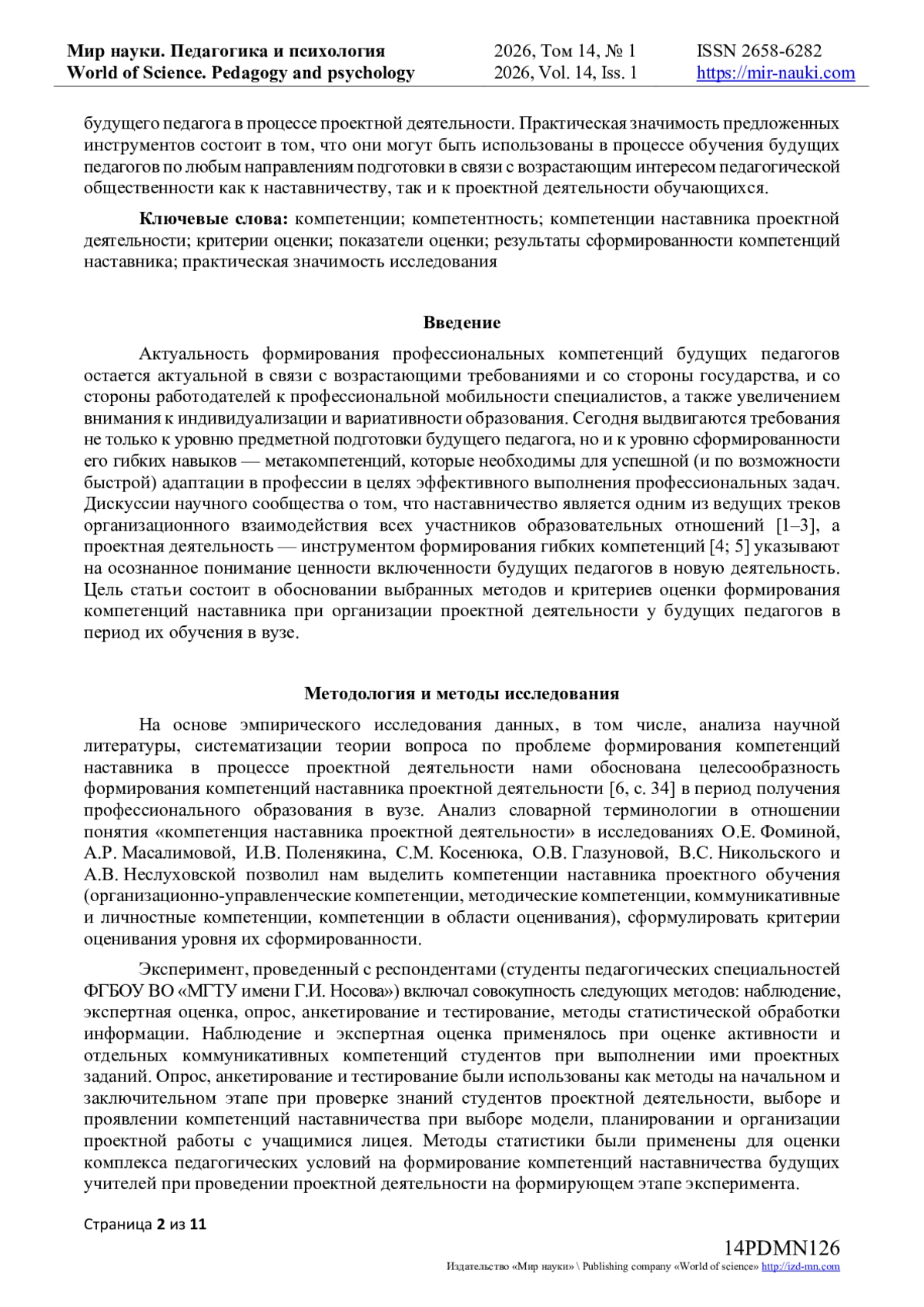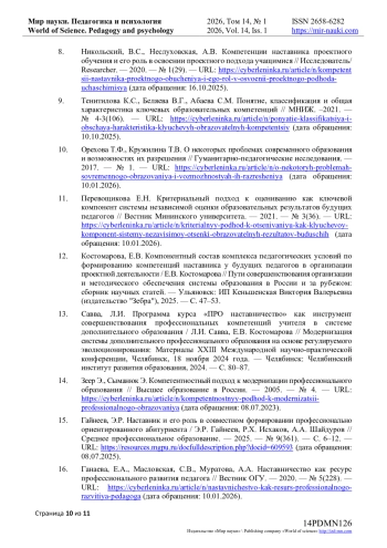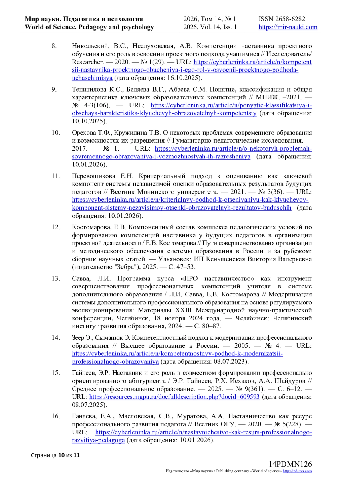 8. Никольский, В.С., Неслуховская, А.В. Компетенции наставника проектного обучения и его роль в освоении проектного подхода учащимися // Исследователь/Researcher. — 2020. — № 1(29). — URL: https://cyberleninka.ru/article/n/kompetent sii-nastavnika-proektnogo-obucheniya-i-ego-rol-v-osvoenii-proektnogo-podhodauchaschimisya (дата обращения: 16.10.2025).