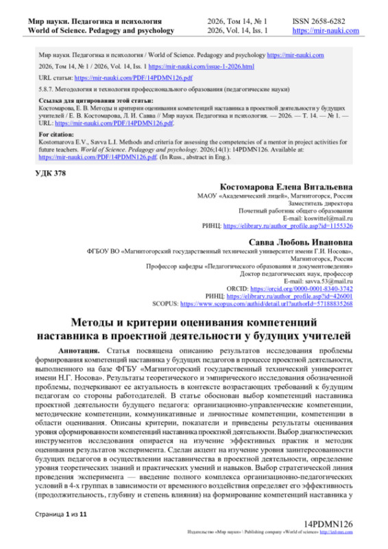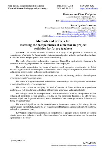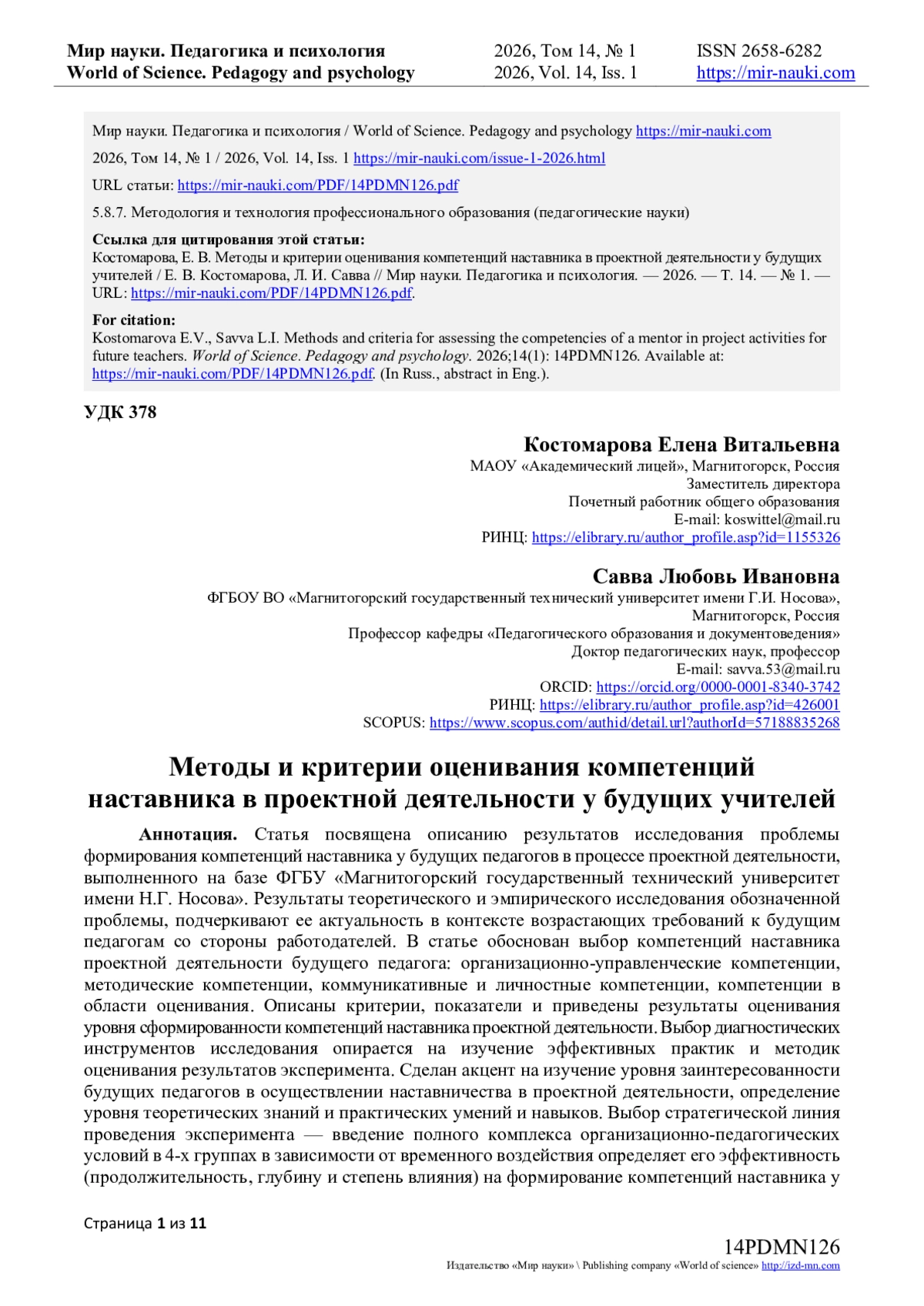 6. Костомарова, Е.В. Модель формирования компетенций наставника у будущих педагогов при организации проектной деятельности / Е.В. Костомарова, Л.И. Савва // Инновационное развитие профессионального образования. — 2025. — № 3(47). — С. 31–39. — URL: https://cyberleninka.ru/article/n/model-formirovaniyakompetentsiy-nastavnika-u-buduschih-pedagogov-pri-organizatsii-proektnoydeyatelnosti (дата обращения: 10.01.2026).