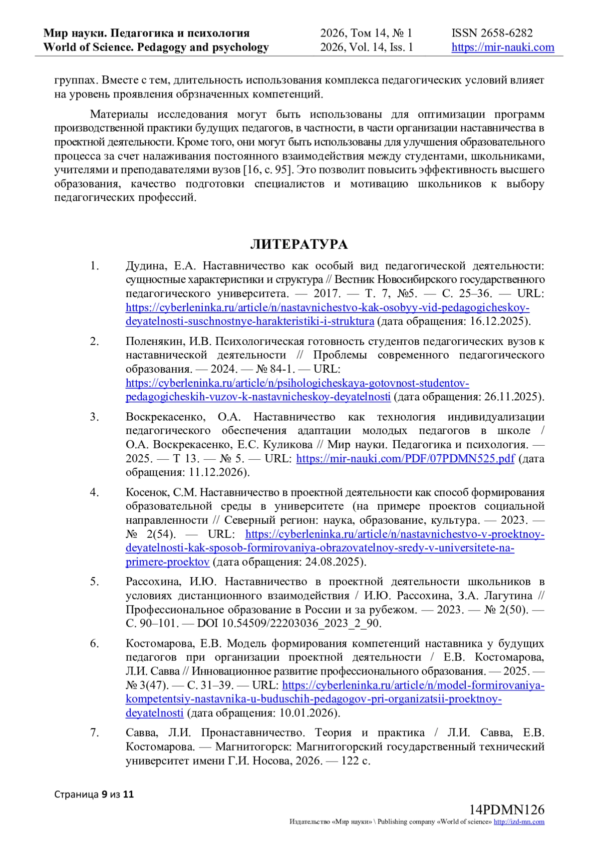 3. Воскрекасенко, О.А. Наставничество как технология индивидуализации педагогического обеспечения адаптации молодых педагогов в школе / О.А. Воскрекасенко, Е.С. Куликова // Мир науки. Педагогика и психология. — 2025. — Т 13. — № 5. — URL: https://mir-nauki.com/PDF/07PDMN525.pdf (дата обращения: 11.12.2026).